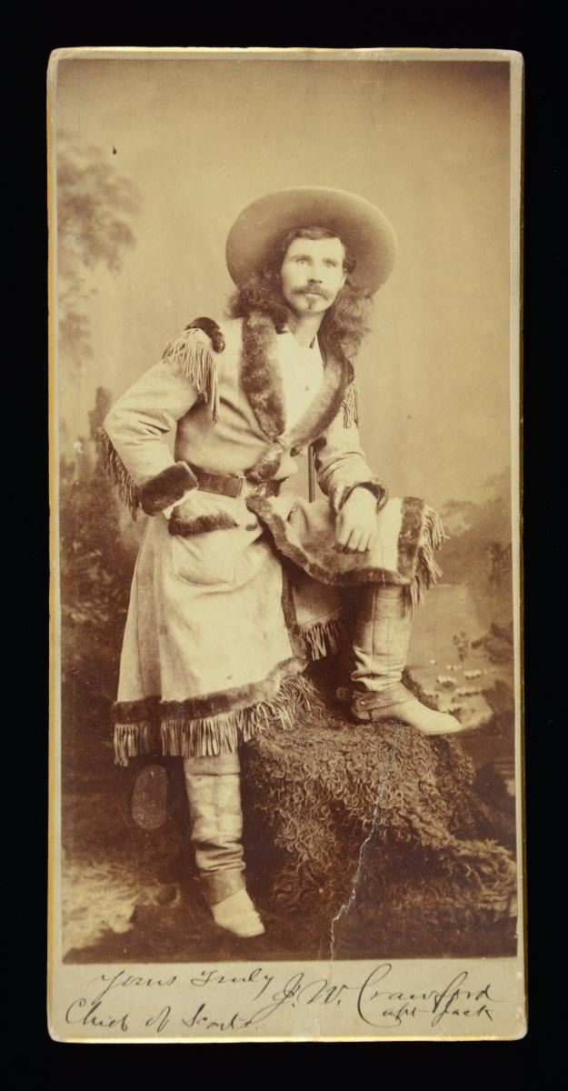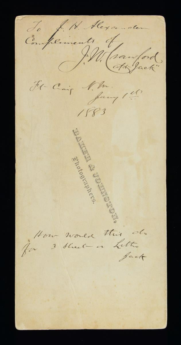 "CAPTAIN JACK" CRAWFORD, 1883, FT CRAIG, NM. 8.25" x 4" photo by Baker & Johnston, Evanston, WY who are best known for series of circa 1881-1882 native American cabinet cards. This unusual size format studio photo shows Capt. Jack posed against painted backdrop wearing rawhide fringed fur lined coat, 1850 eagle buckle belt, boots with attached spurs, and his signature broad brimmed hat. Signed at bottom "yours truly, JW CRAWFORD / Capt. Jack / Chief of Scouts". Reverse signed again "To JH Alexander compliments of JW Crawford / Capt. Jack / Ft. Craig, NM Jany. 1st 1883" in a postscript he asks "How would this do for a 3 sheet or litho / Jack"; Alexander must have been his publisher. CONDITION: very good image, about 2" vertical crack at base. PROVENANCE: Martin Lane Historic & Western Americana Lifetime Collection. (02-21950/JS). $500-700.