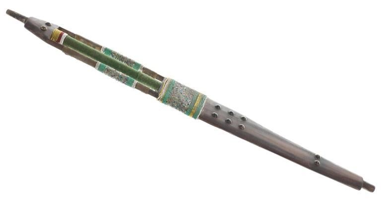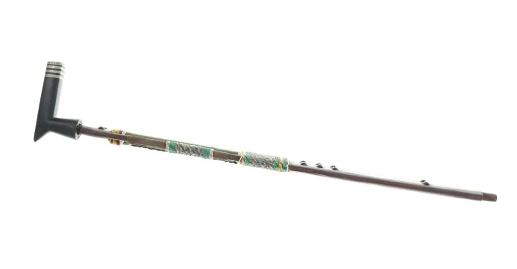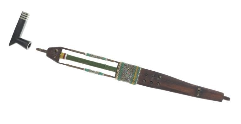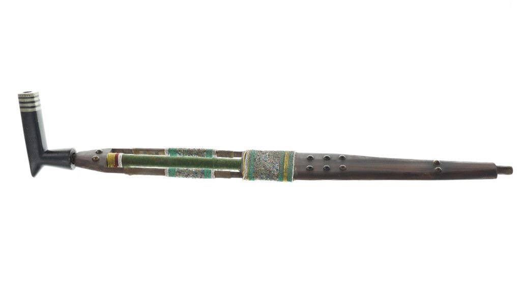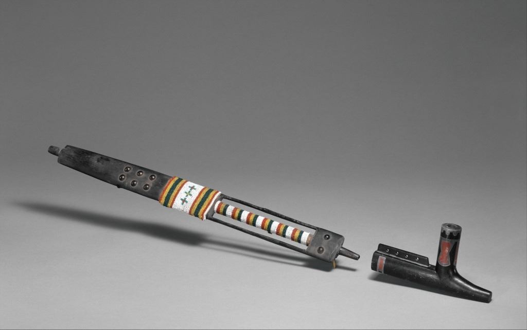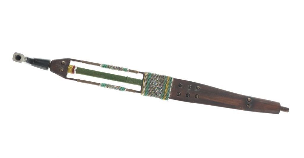 Provenance: From the ex-Dale Harrison collection. The only known other example with this exact cutout design and beadwork known to exist outside of the 1885 Ojibwa pipe and stem in the Met Museum collection. The pipe and stem together measure 31.75”. Stem is 28”L by 2 7/8”W. Pipe bowl is 5.25” by 2.75” by 1.25”.