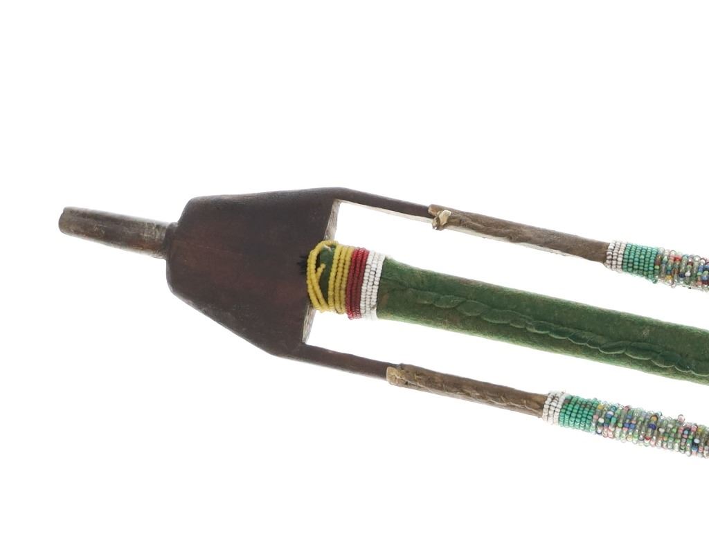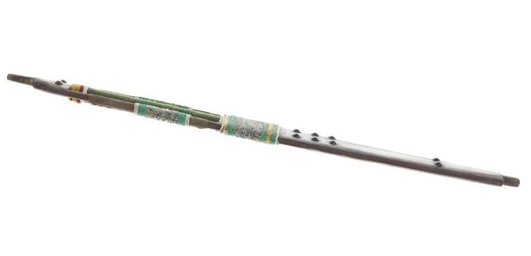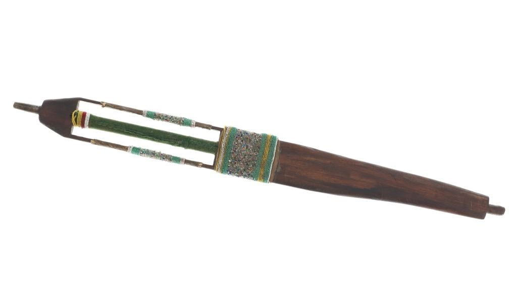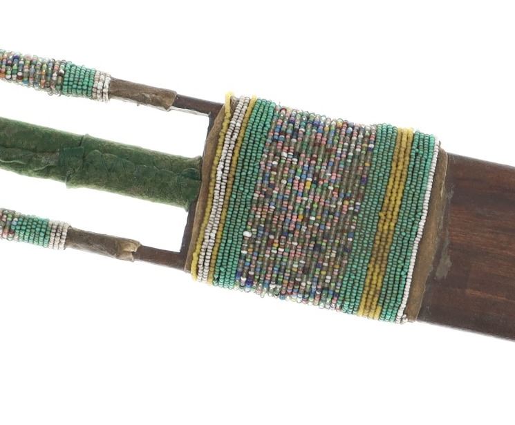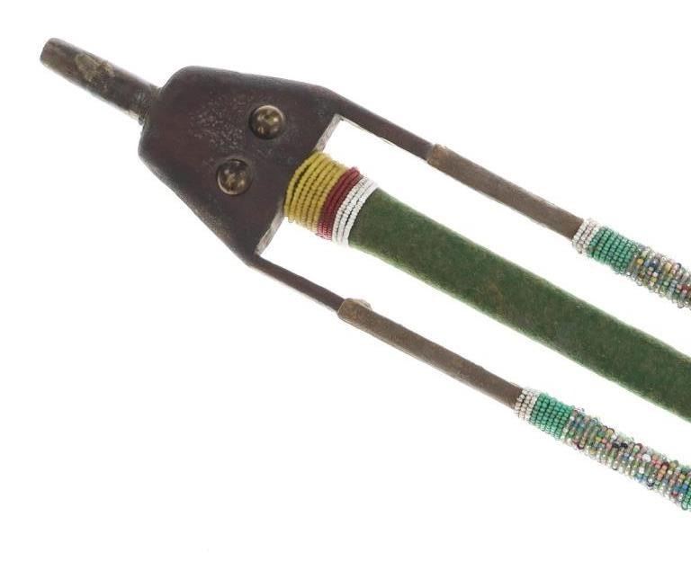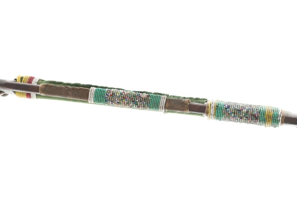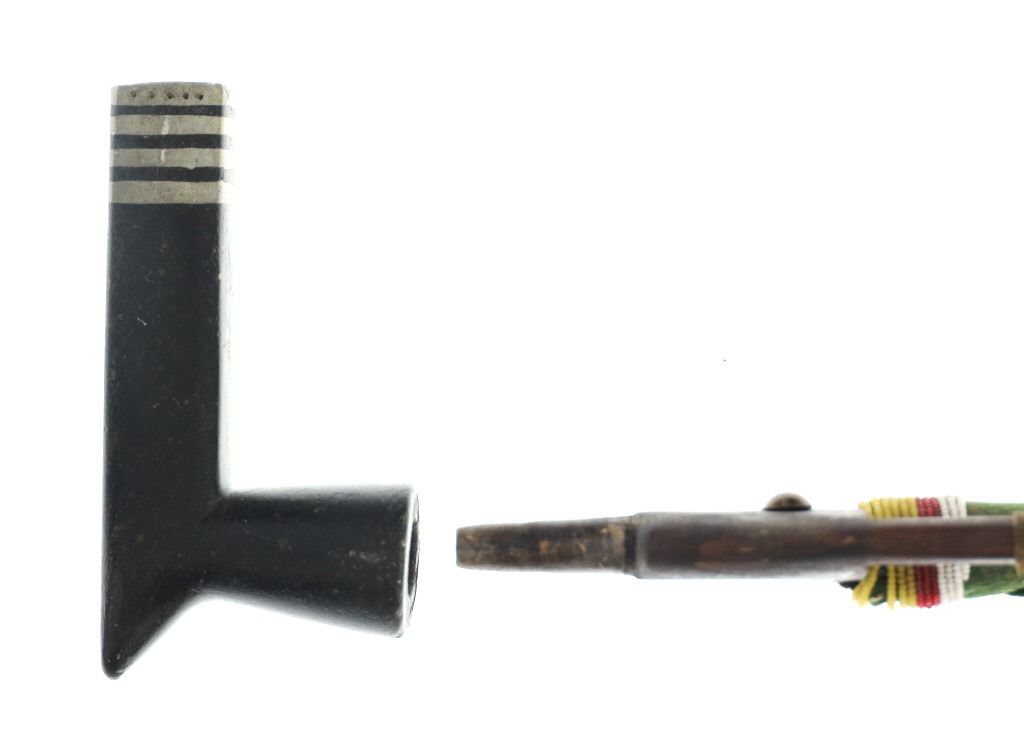 The lot features an unusual and scarce Ojibwa cut out and beaded stem and pipe bowl in nearly identical, rare form as the pipe in the The Metropolitan Museum of Art collection. The puzzle stem and pipe was collected from the Ojibwa (Chippewa) of Northern Minnesota and is from the Dale Harrison collection. The piece shows a carved wood stem with a puzzle or cut out pattern showing two long rectangular cutouts at the pipe connection side with all three of the sections being wrapped and beaded. The center section is wrapped in thick green trade clothe stroud wool which is trade thread sewn and shows rows of early glass trade seed beads in chalk white, greasy yellow and semi-transparent red. Under the clothe you can see a parfleche rawhide wrap and a bundle of hair (likely a medicine bundle of sorts). The outside sections are both wrapped in parfleche rawhide being sinew sewn and adorned with older glass trade seed beads in a banded design of chalk white, medium green and the center section being a “crazy” pattern with many different colors. Below the cutout at the center of the stem shows a wrap of parfleche rawhide which is sinew sewn and also covered in early old glass trade seed beadwork in a banded design with prominent greasy yellow beads. After the beadwork shows a section of six concho larger tacks with dark coloring, being metal tacks covered in a patina’d brass and near the bottom and at the top two more (four) tacks. The only other pipe in this exact form is the circa 1885 Ojibwa pipe bowl and stem in the Metropolitan Museum of Art collection accession number 2011.154.75a, b from the Ralph T. Coe Collection. This Met example shows the exact same oblong rectangle cutouts with wrapped center section having the wrapped rear section with banded beadwork and then six concho tacks with a dark wood color paired with a dark pipe bowl in catlinite, chlorite, lead / pewter.