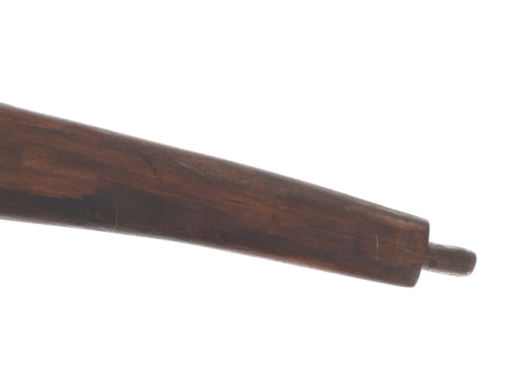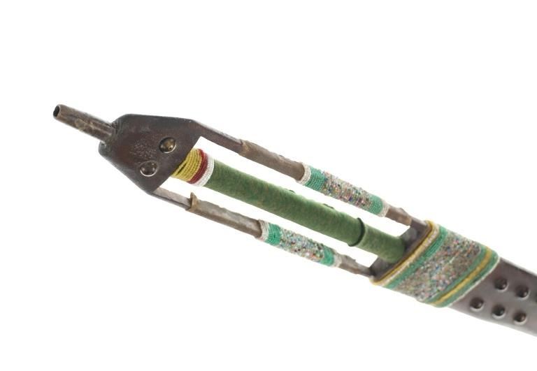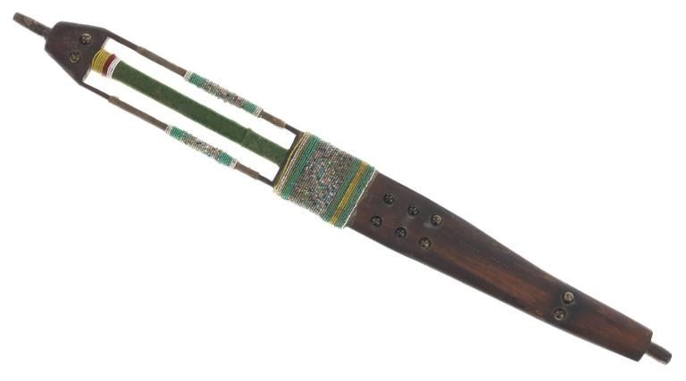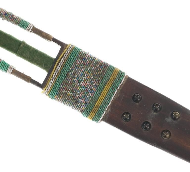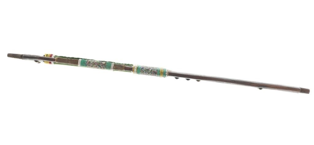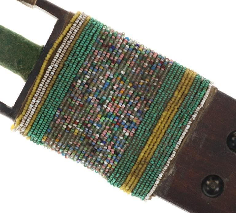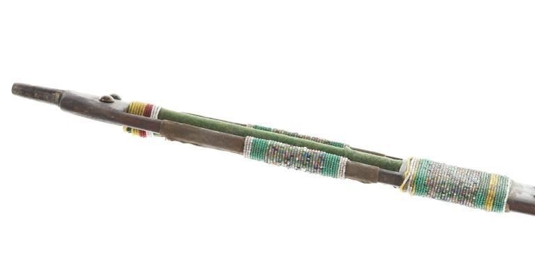 The lot features an unusual and scarce Ojibwa cut out and beaded stem and pipe bowl in nearly identical, rare form as the pipe in the The Metropolitan Museum of Art collection. The puzzle stem and pipe was collected from the Ojibwa (Chippewa) of Northern Minnesota and is from the Dale Harrison collection. The piece shows a carved wood stem with a puzzle or cut out pattern showing two long rectangular cutouts at the pipe connection side with all three of the sections being wrapped and beaded. The center section is wrapped in thick green trade clothe stroud wool which is trade thread sewn and shows rows of early glass trade seed beads in chalk white, greasy yellow and semi-transparent red. Under the clothe you can see a parfleche rawhide wrap and a bundle of hair (likely a medicine bundle of sorts). The outside sections are both wrapped in parfleche rawhide being sinew sewn and adorned with older glass trade seed beads in a banded design of chalk white, medium green and the center section being a “crazy” pattern with many different colors. Below the cutout at the center of the stem shows a wrap of parfleche rawhide which is sinew sewn and also covered in early old glass trade seed beadwork in a banded design with prominent greasy yellow beads. After the beadwork shows a section of six concho larger tacks with dark coloring, being metal tacks covered in a patina’d brass and near the bottom and at the top two more (four) tacks. The only other pipe in this exact form is the circa 1885 Ojibwa pipe bowl and stem in the Metropolitan Museum of Art collection accession number 2011.154.75a, b from the Ralph T. Coe Collection. This Met example shows the exact same oblong rectangle cutouts with wrapped center section having the wrapped rear section with banded beadwork and then six concho tacks with a dark wood color paired with a dark pipe bowl in catlinite, chlorite, lead / pewter.
