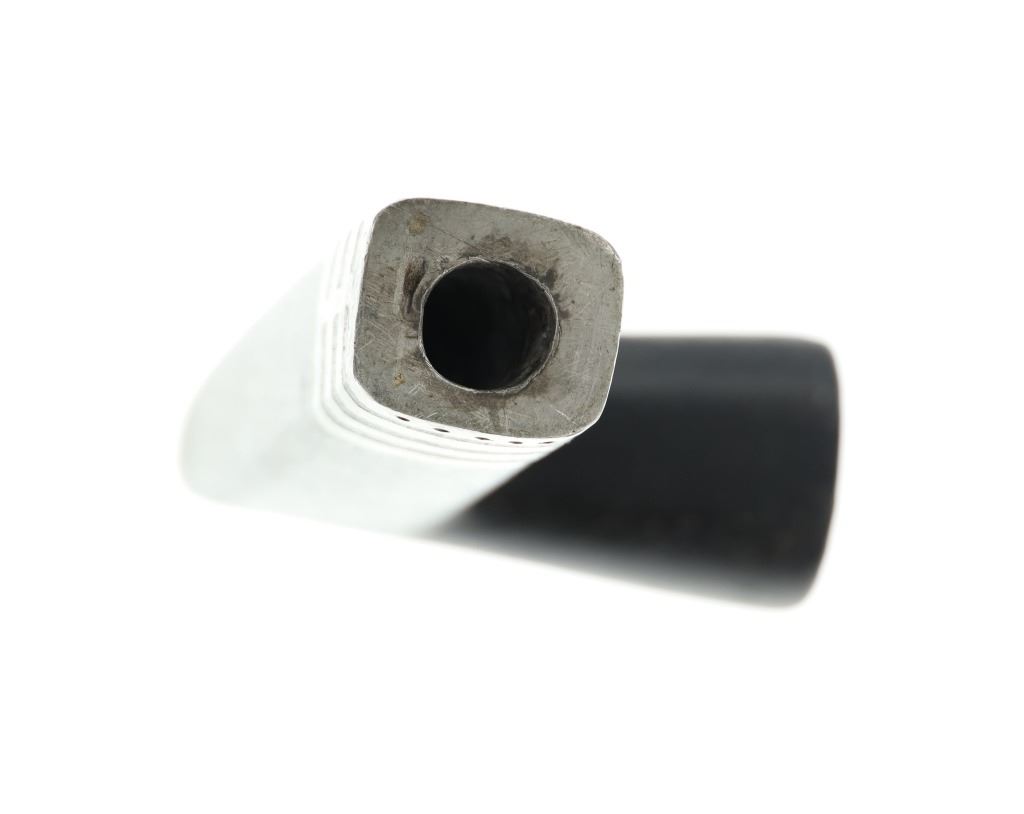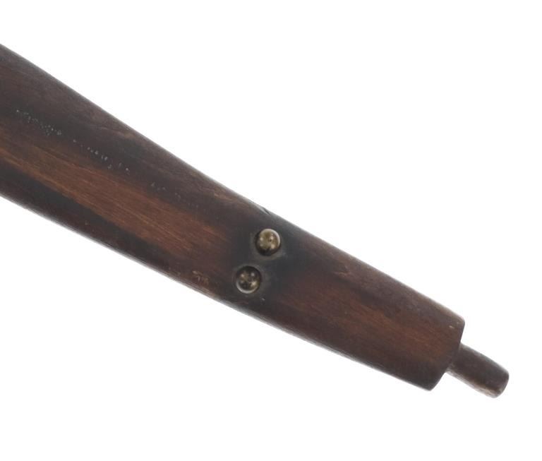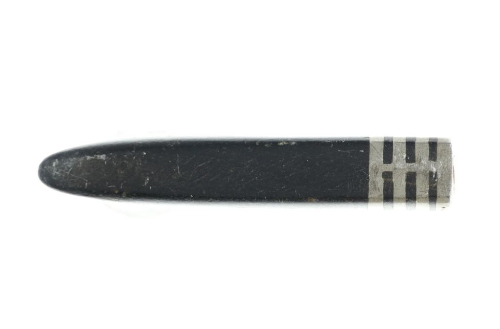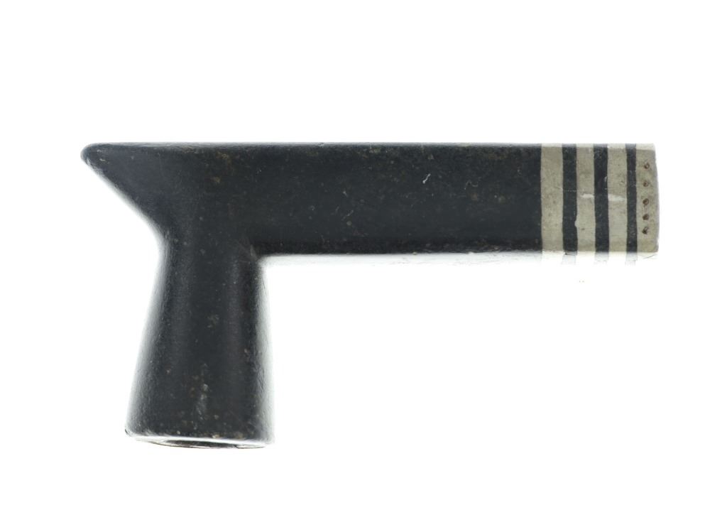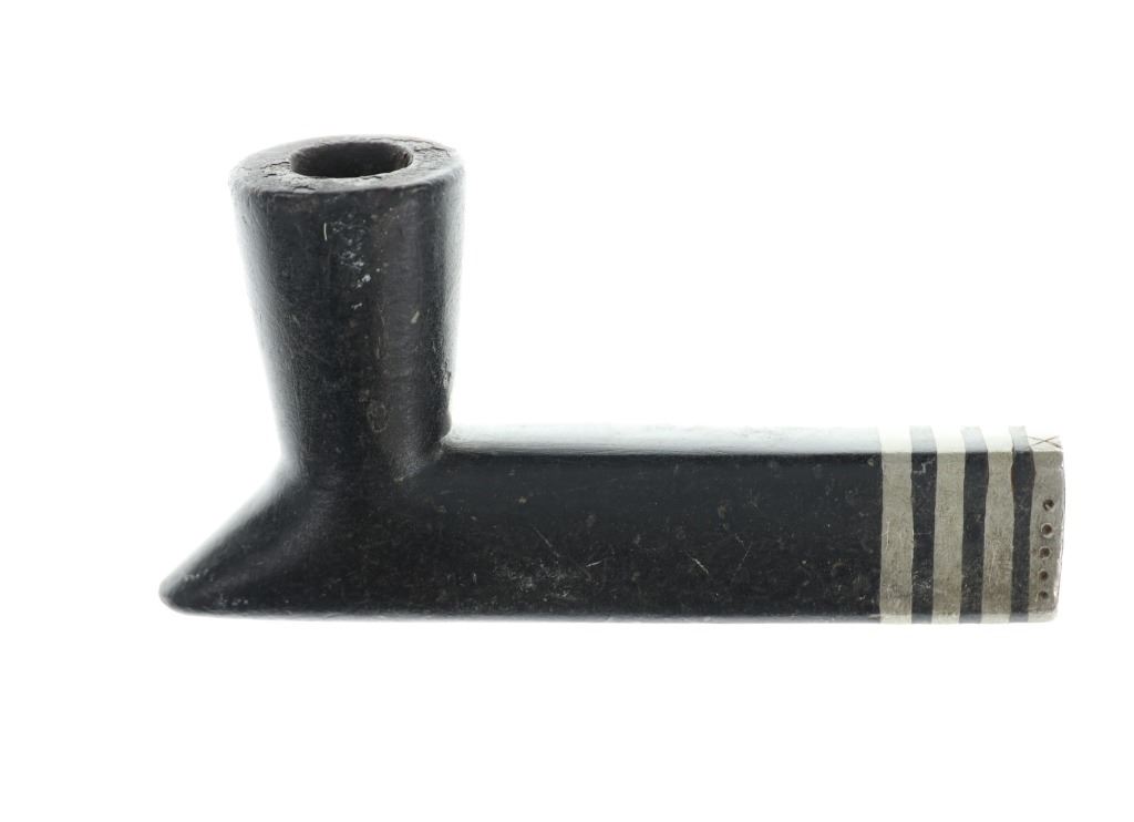 The pipe bowl with this lot shows a classic larger elbow “T” pipe carved from black Minnesota pipe stone known as steatite or chlorite inlaid with bands of artful lead / pewter bands at the smoking end with a pewter cap having six circular engraved spots on each side. The pipe bowl has a nice shiny polish with small scratches from use.