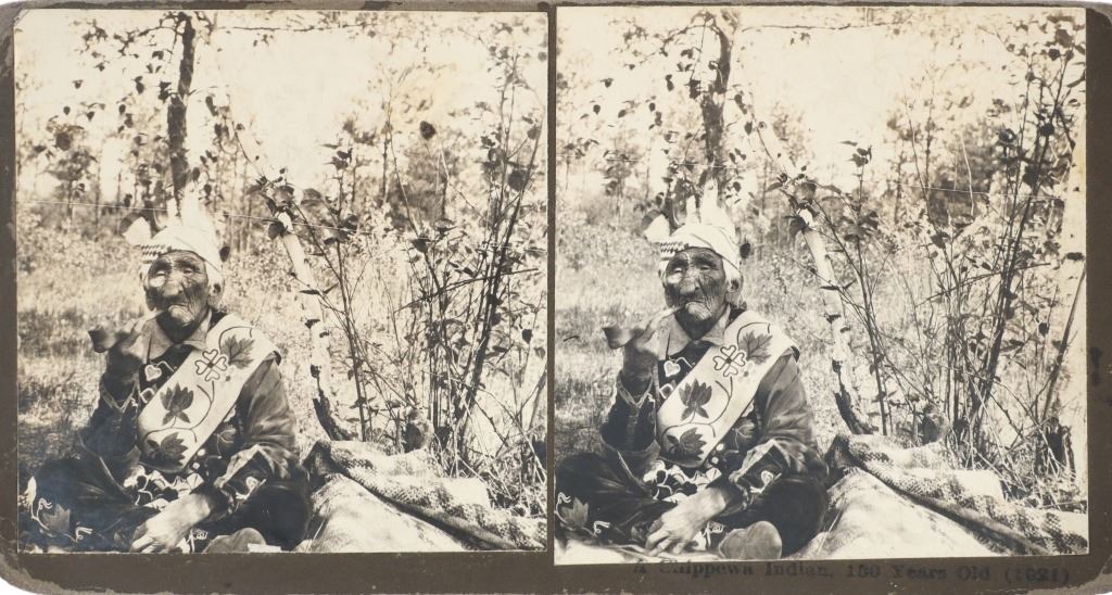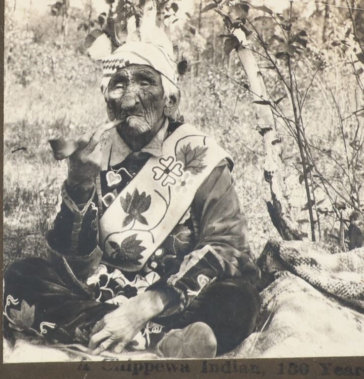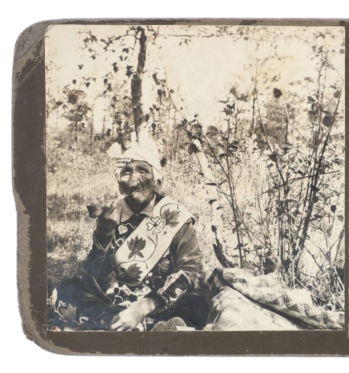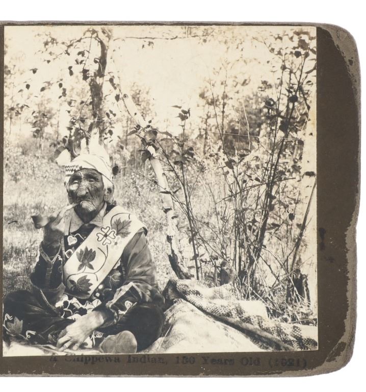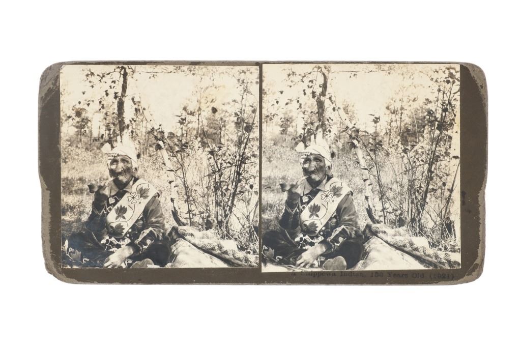 Featured in this lot is this amazing and rare stereoview of the well-known Ojibwe Tribe member, Ga-Be-Nah-Gewn-Wonce or "Wrinkled Meat", reputed to have died at 137 or 138 years old, circa 1921. John Smith, whose Native American name means, "Wrinkled Meat" was a Ojibwe tribe member active for over 130 years in the Cass Lake, Minnesota area. During his long life, he was thought to have had eight wives and only one child, an adopted son named Tom Smith. Tom was an instrumental part of John’s life until the end. He continuously vouched for his father’s age when others disbelieved. According to the Chippewa people, eyewitness accounts, and Chief John Smith himself, he was 137 when he died, putting his birth year at 1785. The newspaper in Minnesota that reported his death in 1922, the Star Tribune, attempted to validate his age at the time. The paper pointed out that Smith clearly remembered specific battles that the Chippewa had with their neighbors — the Sioux — that were said to have taken place before the turn of the 19th century. According to the Star Tribune, Smith remembered the conflict of 1812 and frequently boasted that, despite his participation in the conflict, he had never fought against a white man. If he was old enough to fight in the war, say around 18 or 19, his birth year would have been around 1794, which is closer to the year he stated. According to Paul Buffalo's written stories, he was elected chief of the Chippewa people but declined the position due to a lack of desire for responsibility. His adopted son reported that he was active in daily life, even in his final year, greeting visitors and telling anecdotes while living at his son's house. n February 1922 he contracted pneumonia, which due to his very advanced age, resulted in his death. Smith is buried at a Catholic Church cemetery in Cass Lake, Minnesota. His gravestone lists his birth year as 1784. The stereoview card has no publisher name listed. It shows John Smith sitting on the ground wearing traditional Native American clothing and feathers in his headband. He is smoking a large pipe has he looks into the distance. The bottom right of the stereoview reads, "A Chippewa Indian, 130 years old (1921)", while the back shows a torn paper giving history on John Smith. Most can not be read due to the tears of the paper. Provenance: From the personal collection of Francoise Perriot (Françoise Perriot), noted historian author of the West and Native Americans. Perriot’s published works include such books as “Les Indiens et La Nature” (Indians and Nature) 2017, “La Conquête du Far West” (The Conquest of the Wild West) 2007, “Les Indiens d'Amérique du Nord” (North American Indians), “Guide Bleu : Etats-Unis Ouest Americain” (Blue Guide: United States West America). This piece and others come from her time collecting in Montana and the West, her book “Les Indiens et la nature” is one of the most notable in France documenting photographs of the west. The photo shows good condition overall with wear to the card it is on, but no wear or damage to the actual photo. It measures 3 1/2" L x 7" W.