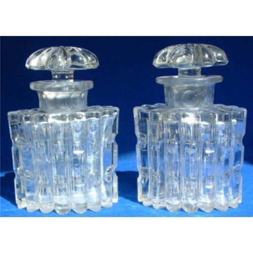 An Unusual and Rare Pair of Hand Cut and Pressed English Crystal Tea Caddies complete with original firm fitting stoppers. The main outer bodies of oval form with reeded and thumb pattern decoration on star cut bases. Last half of 19th Century. These pieces are unmarked. <p> In overall very good condition with no chips except for two small losses on one stopper (see image). There is clouding inside both. <P> Dimensions: Height: (overall as shown) 6" (15.5cm). Width: 4.25" (11cm). Depth: 3" (7.5cm).