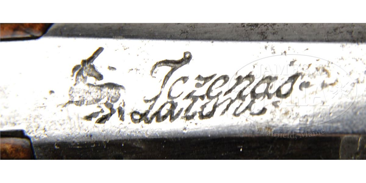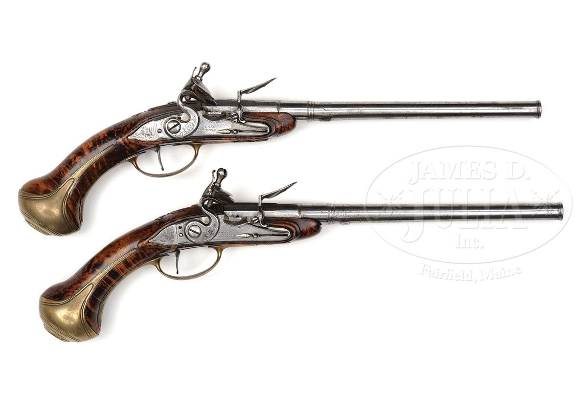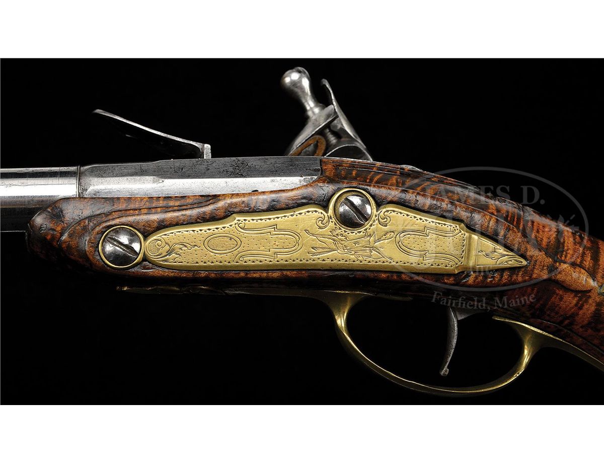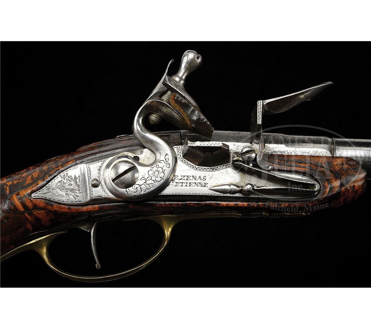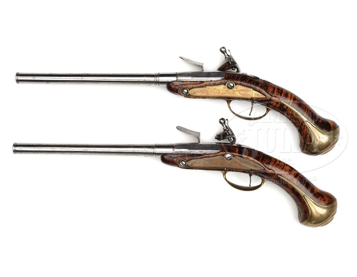 NSN. The prancing unicorn deeply struck next to the name "TEZENAS LARONI" is the mark of Francois who worked 1689-1720, Stockel no 1083. Stepped lock are engraved with a boar's head pierced by an arrow. Hammer engraved with a flower and frizzen engraved with line border. Lock signed "TEZENAS A ST ETIENNE". Oct to 16 sides to round bbls have muzzle rings are deeply rifled throughout their length. Brass mounts relatively plain with nicely engraved solid brass sideplate repeating motif of boar head pierced by an arrow present on the lock. Figured French walnut stocks are molded around lock, tang and sideplate. Spurred butt caps are relatively austere with line borders and stippled engraving. NOTES: Rifled turnoff pistols of the 1680s and 90s were the most powerful pistols available because of the tight fit of the ball. These are exceptionally long rifled pistols. PROVENANCE: Collection of Dr. Douglas Sirkin. CONDITION: Bbls cleaned bright over pitting. Frizzens are cleaned bright. Locks cleaned bright. Engraving fairly crisp. One hammer replaced during pistol's working life. Stocks are very good with crisp carving and one repair forward of lock of one pistol and piece of wood replaced forward of the lock of one pistol. 4-49811 MZ49