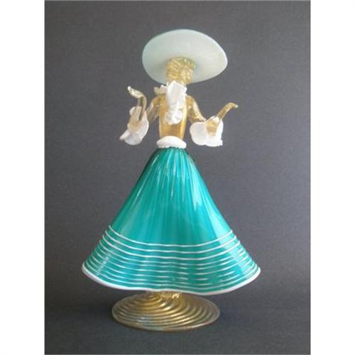 WE PRESENT TO YOU A PAIR OF MURANO ART GLASS FIGURINES, SHOWING THE PAT'D SALVIATI SWIRLED BASE WITH GOLD FLECK AND A SNAPPED PONTIL.THE FIGURE IS ATTACHED WITH THE BODY BACKED BY A CRIMPED LEAF BEHIND HER DRESS AND THE DRESS FLARING OUT TO SIX INCHES WIDE IN CASED GLASS WITH LATTICINO STRANDS WRAPPED AROUND AND PLEATED UP TO HER WAIST, ALL IN A TEAL BLUE/GREEN. ON HER TORSO IS A RUFFLED BREAST, CRIMPED AND APPLIED JUST AS HER SLEEVES ARE CRIMPED AND APPLIED IN THE WHITE, WITH THE TRANSLUCENT TORSO SHOWING GOLD FLECS JUST AS HER NECK,HAIR,AND FACE. TOPPED OFF WITH A CASED GLASS WIDE RIMMED HAT, WHITE ON THE UNDERSIDE AND MATCHING THE DRESS WITH THE TEAL BLUE/GREEN ON THE TOP, ALSO WITH A SNAPPED PONTIL. WE HAVE PRICED THIS OUT AS A SINGLE, AS YOU CAN SEE THERE ARE TWO! TWO FOR THE PRICE OF ONE. THE DESCRIPTION OF THE MALE DANCING FIGURINE IS ALMOST THE SAME AS THE FEMALE, BUT DUE TO BREAKAGE WE HAVE VIRTUALLY PUT IN THE SECOND ONE AS A PACKAGE DEAL. A PIECE OF THE ARM IS TAPED TO HIS SIDE AND THE HAT WAS GLUED BACK TOGETHER. THE HEAD WAS ALSO GLUED BACK ON, SO WITH ALL THAT DAMAGE TO THE MALE WE HAVE JUST ADDED HIM IN. THEY STARTED OUT AS A PAIR SO THEY SHOULD REMAIN TOGETHER, WHEN DISPLAYED THE DAMAGE REALLY IS NOT THAT VISIBLE.PLEASE E-MAIL ME IF YOU DON'T WANT THE MALE FIGURINE