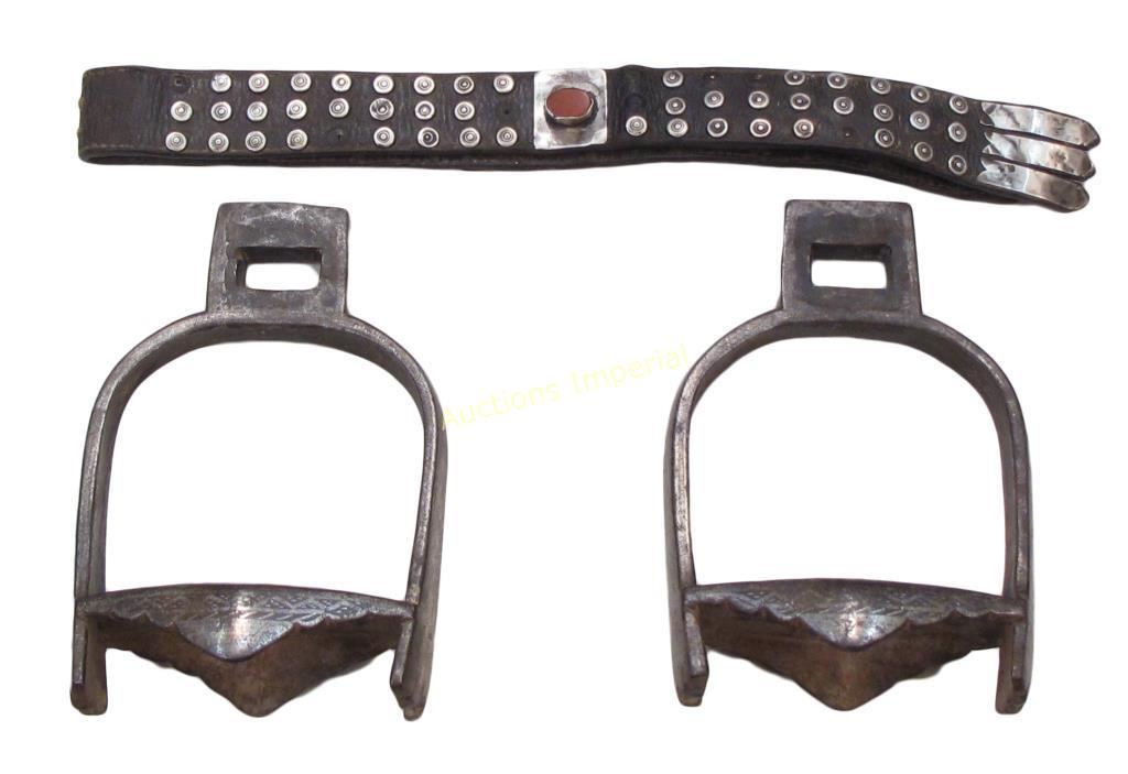 The massive stirrups wrought entirely of steel with deeply-profiled tread plates and inlaid overall with silver. The leather neck trapping set with silver studs and carnelians. First half of the 19th century. Overall length of trapping 88.6 cm.