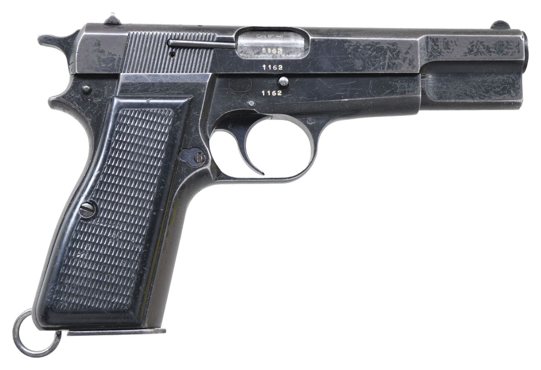 NATIONALE HIGH POWER SEMI-AUTOMATIC PISTOL. Cal. 9mm Luger. S# 245PY65162. Bbl. 4 5/8". High Power semi-automatic pistol mfg. in Belgium by Fabrique Nationale under contract for the National Guard of Panama in 1982. The left side of the slide is marked "FABRIQUE NATIONALE HERSTAL BELGIQUE/ BROWNING'S PATENT DEPOSE". Top of the slide is marked "REPUBLICA DE PANAMA/ (PANAMANIAN COAT OF ARMS)/ GUARDIA NACIONAL", just ahead of the rear sight. Right side of the frame is marked with Belgian commercial proofs on the forward trigger guard web. Metal components exhibit a black enamel type finish, which was applied over a parkerized finish. Frame is mounted with 2-piece checkered black synthetic grips. Left side of the frame is mounted with a lanyard ring. Fixed half-moon blade front sight, with dovetailed square notch rear sight. All numbers are matching via "1162" and are present on the frame, slide, and bbl. in the "stacked" fashion. Slide stop lever is a blued replacement. MAGS: 1 13-rd. mag., with smooth parkerized body and blued button floorplate. CONDITION: metal components retain large amounts of their black enamel finish, exhibiting areas of flaking, wear, and handling marks overall that show through to parkerizing, with areas of edge wear that show through to gray patina. Very bright bore, exhibiting light to mild pitting, while retaining strong rifling throughout. Grips show mild smoothing, as well as scattered marks and impressions from handling and storage, but otherwise remain sturdy and serviceable. PROVENANCE: the Estate Collection of Charles Wagner. (25-275/MLW). MODERN. $800-1,200.