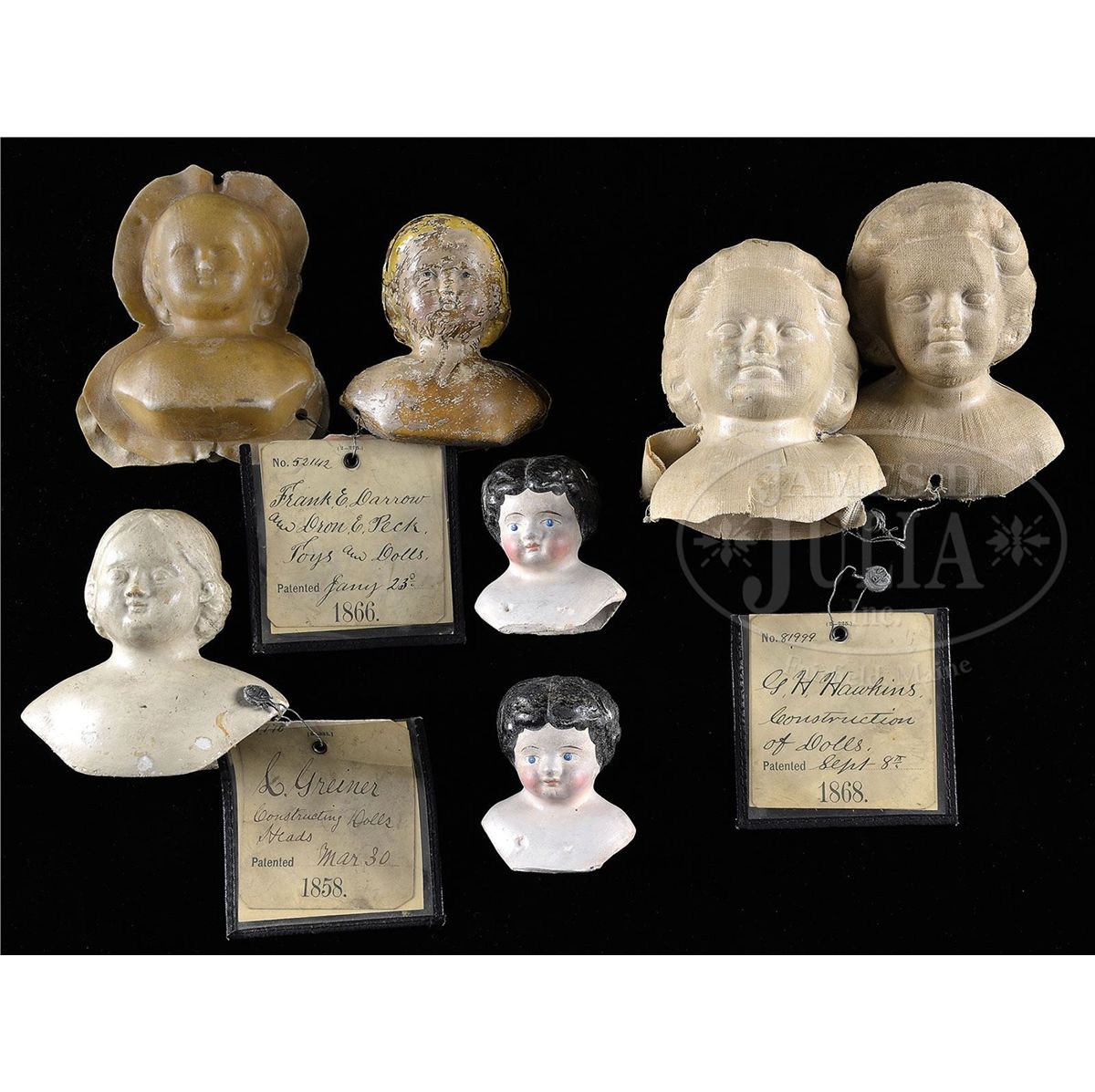 Here we have an historically important collection of seven patent models that were subsequently used to produce American papier mache shoulder head dolls from the 1850s - 1870s. Included are Hawkins, Shrand, Greiner, Darrow, and Dron & Peck, as well as a pair of papier mache shoulder heads with partial labels which are incomplete. SIZE: Largest 6" (15 cm), smallest 4" (10 cm). CONDITION: Varies between good and very good. 1-13313