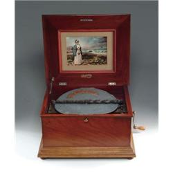 RARE "PERFECTION" 14" DISC PLAYING MUSIC BOX. American made, circa late 1890's. Fine mahogany locking case with key manufactured by the Newark, NJ firm. This double comb machine features lid with lithographed image of a pensive woman looking out to sea. Elaborate brass holder bar. Comes with 12 discs. SIZE: 20" w. x 10 1/2" t. x 17" d. CONDITION: Case in near excellent condition, no broken teeth, and deep rich tone. 1-4589 (3,000-5,000)