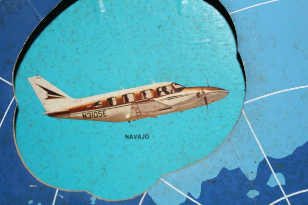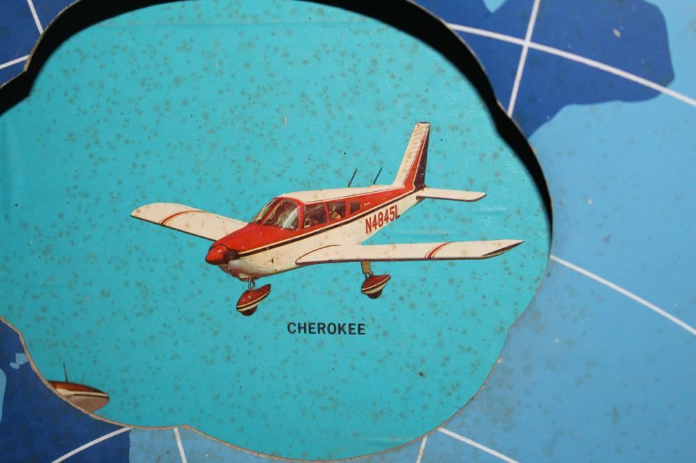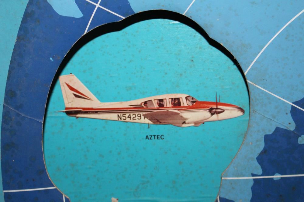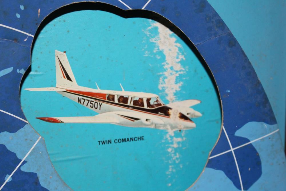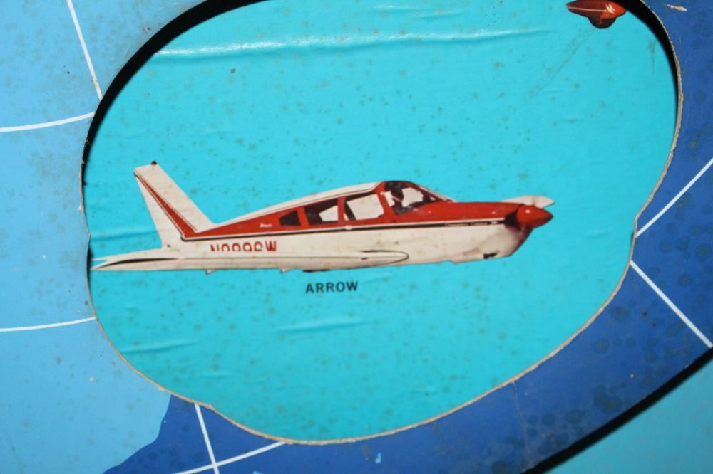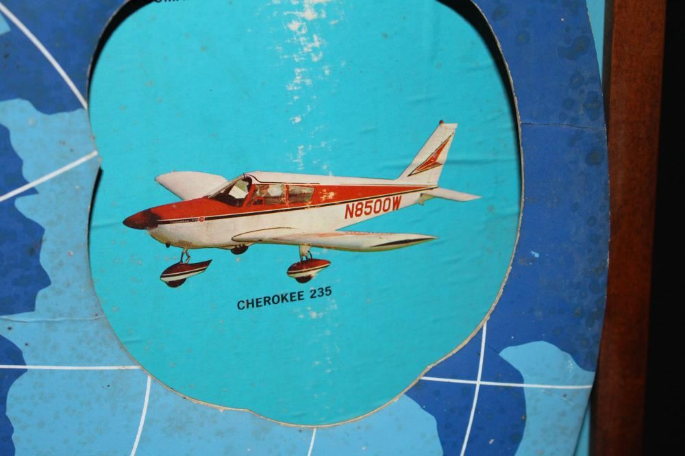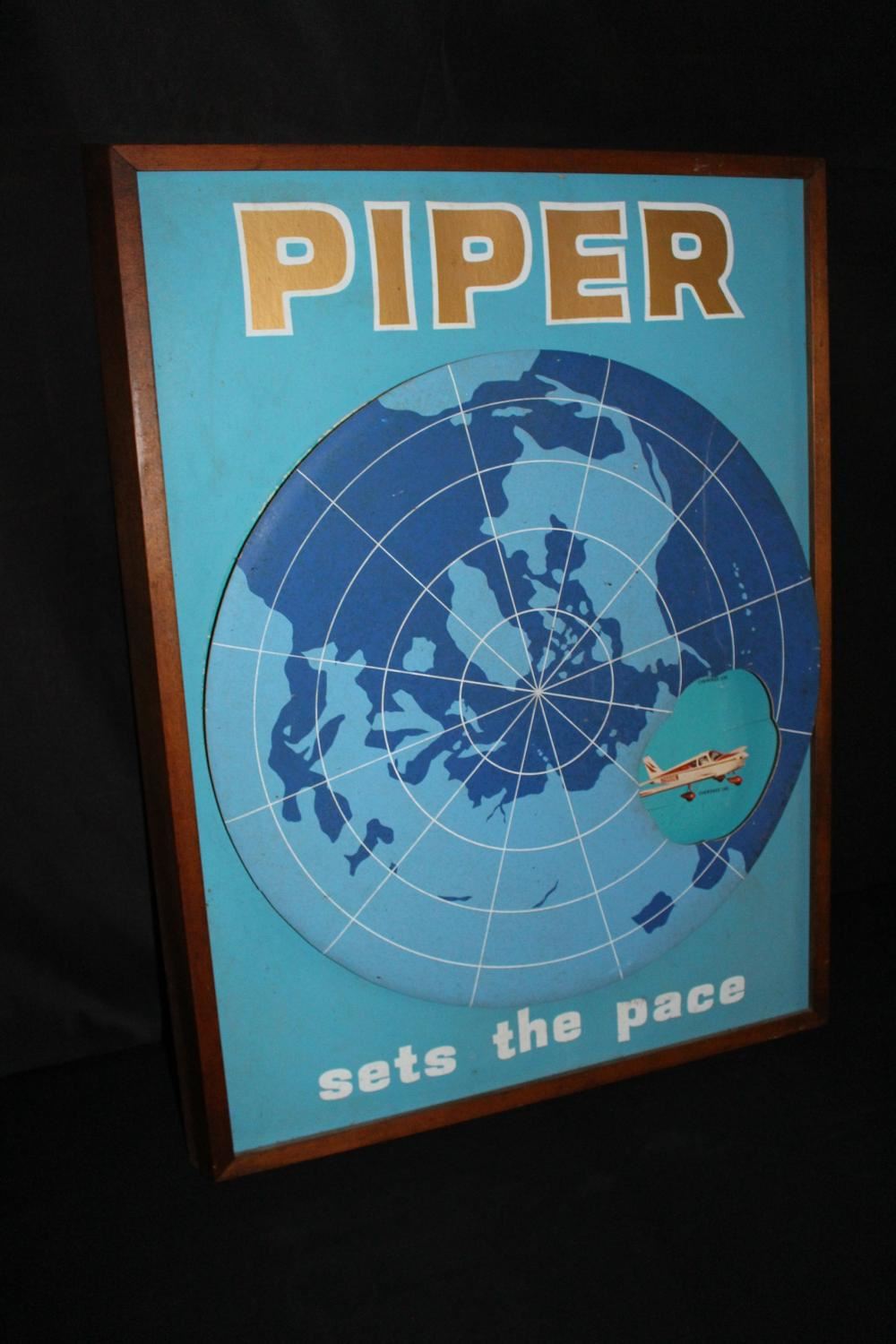 WOW, THIS IS A REALLY COOL SIGN. WOOD FRAME, CARDBOARD SIGN. THE DISC IN THE CENTER ROTATES AROUND AND EXPOSES THE WHOLE LINE OF PIPER AIRPLANES. LIGHT WEAR. 33 1/2 X 25 1/2. APPROXIMATE SHIPPING COST $50 TO $75.