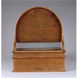 RARE "PLAY BALL" TRADE STIMULATOR. One of only a few known to exist, this early oak trade stimulator is attributed to Waddel, circa 1894. Actually slightly larger than a "Play Ball" machine, it features a large tombstone design and curved glass front and works similar in principle to a penny drop machine, but instead of money, the customer would be given a steel ball to drop through a pin playing field that randomly guides the steel ball to a numbered hole below. When the steel ball falls through a numbered hole, a corresponding numbered tab "pops-up" to record the "score" (number of cigars the customer was to receive). The steel ball would then continue through to a corresponding horizontal groove, above the cash drawer, that is incremented with a paper label (some have been replaced) to record the play. This machine is a unique combination of trade stimulator, cash register, and inventory control that is exemplary of early American Ingenuity at it's best. Early time the cash register drawer is opened, to give the customer a steel ball in exchange for "cash", the "pop-up" tabs reset themselves. At the end of the day, when the glass door above the "inventory control" grooves is open, all the balls in the grooves fall back into the cash register drawer below. Thus resetting the machine for the next day. Keyed drawer is stamped "30" (believed to be a serial # rather than a model #) has six carved out cash receptacles and ball catcher. Front of machine has plaque indicating "Sold by Hy Kolk, Davenport, Iowa". Kolk was listed as a traveling salesman for Otto Albrecht & Co. between 1894-1897. Intended to stimulate cigar/tobacco sales, the customer would buy a 5-cent cigar and use the machine in an attempt to win more. This piece also served as a cash register and early inventory control as it tracked how many cigars were actually given away. Pictured in Bueschel's book "An Illustrated Price Guide to the 100 Most Collectible Trade Stimulators, Vol. II". SIZE: 19" w x 24" h x 18" d. CONDITION: Bottom missing a couple wood slats, tabs show some loss to nickel plating, one small piece of molding is loose, otherwise very good to near excellent, with key. 1-3201