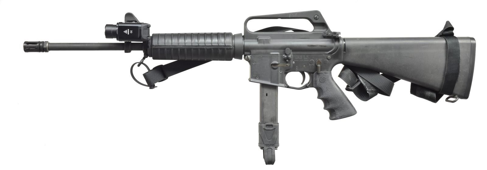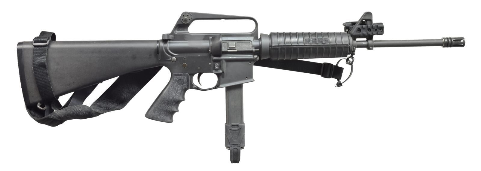 CARBINE. Cal. 9mm. S# NL002612. Bbl. 16". Today the pistol caliber carbine market has exploded into an enormous faction of the industry. One of the early pioneers, aside from prior SMG configurations simply offered in semi auto was the full-size Colt AR15 chambered in 9mm NATO. This is a pre-1994 example of their Sporter Lightweight, which outwardly resembles the popular & then common AR15 A2 carbine. Redesigned as a straight blowback system & fed w/ a proprietary mag. through the use of pinned mag. blocks which also contained the feed ramp & ejector, the Colt carbine was an early pioneer. In earlier days, 9mm was often thought of & utilized as a common SMG rd., but has since been normalized in this extremely popular category. The bbl. representing a traditional pencil profile is marked “C MP CHROME BORE 9MM-NATO” & terminated w/ an A1 flash hider. The protected post front sight sans the gas block appears no different outwardly, but contains no bayonet lug. The rear sight is a standard E1 flip up peep located at the rear of the carry handle. Since the necessary ejection port length was far less than its big brother, Colt employed a cut down modified dust cover w/ an ejection port buffer to utilize the same real estate as the 223. There is no forward assist. Full length 10.5" A2 rear stock w/ trapdoor & swing swivel at the base. Traditional rnd. carbine length A2 style handguards w/ tapered delta ring. Hogue finger groove rubber pistol grip & Magpul extended trigger guard. Front sight block has aftermarket 2" picatinny rail sections at 3 & 9 o’clock & currently hosts a Valkyrie PL-2 O-Light. M16 cut bolt carrier. Lower receiver still retains original pinned blocking mechanism which was employed by Colt beginning in the late 1980s. T.E.A.M. black nylon sling system. MAGS: 1 Colt 32 rd. mag. w/ Magpul. CONDITION: finish is complete & consistent on all exposed metal surfaces. A few sm. areas of thinning at high spots & in areas that typically succumb to vertical storage. On board O-Light appears bright & functional. Bore is shiny w/ strong rifling. Fire control mechanism appears to function correctly when cycled by hand. (21-1062/JZ). MODERN. $700-1,100.
