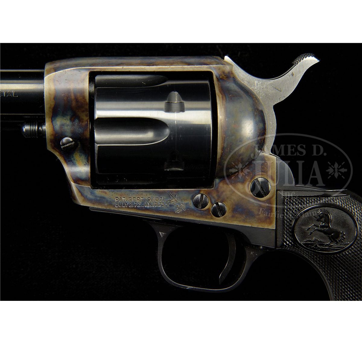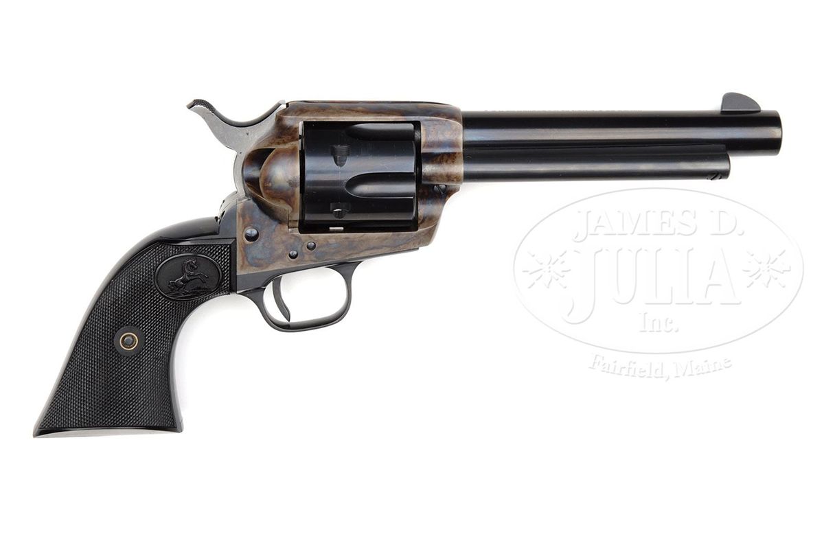 SN 357175. Cal. 38 Spcl. Blue & color case hardened with 5-1/2" bbl, full thick front sight and 1-line block letter address with model & caliber marking on left side. Left side of frame has 2-line, 3-patent dates and rampant Colt. Mounted with rampant Colt hard rubber grips matching numbered to this revolver. Right side of front & backstraps, under the grip,have the matching SNs. This revolver is one of the few assembled after WWII with pre-WWII produced & finished parts. This revolver will letter with 5-1/2" bbl, in 45 caliber with blue finish and type of stocks not listed. Remarks section will show that it was charged to "Arms Selling Expense and shipped on May 25, 1949 in a one gun shipment to Mr. Graham Anthony, President of Colt's Manufacturing Company in Hartford for Mr. Charles B. Cook." Mr. Cook was an executive at The Royal Typewriter Company in Hartford. This revolver was very near the very end of pre-war Single Action SNs and those few revolvers assembled after the war are very rare. CONDITION: Crisp, new & unfired, all matching including grips. 4-48782 JR346