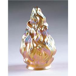 Lot 192 RARE QUEZAL TORCHIERE Wonderful flame shaped shade has gold iridescence with brilliant flashes of raspberry and blue iridescence. Signed inside fitter “Quezal”. SIZE: 7-1/2” l. CONDITION: Very good to excellent. 5-70438