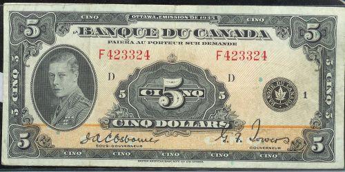 RARE RADAR NOTE! BC-6 1935 $5 French text F423324. Radar notes are extremely scarce for the 1935 series and rarely seen on a "French" note. Worth a premium bid! VF