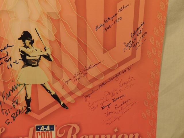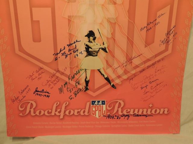 SUPER RARE POSTER COMMEMORATING THE REUNION MEETING OF THE LADIES FROM THE ALL AMERICAN GIRLS PROFESSIONAL BASEBALL TEAM, AND INCLUDES AUTOGRAPHS OF 16 FORMER PLAYERS. POSTER IS 26.5" X 17.5" AND IN EXCELLENT