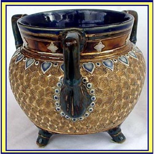 Exceptional little 3-legged and 3-handled Art Pottery Bowl made by Royal Doulton, very early in the 1900's. Strong Arts and Crafts influence in the design.<BR>Measures just under 4 1/2inches high.<BR>Round bowl stands on 3 legs, each in the form of a flower, coloured in very earthy browns and blues. The 3 handles, joining collar to body at right angles echo the colouring of hte legs and the hand scratched pattern through the blue glaze is clearly visible. Around the join of the handle to the body is an oval of raised 'eyes' - raised white hemispheres with blue circles in the center. These are highly reminiscent of the symbols used in the Near East to ward off the 'Evil Eye'. <BR>A ring of the same 'eyes', interspersed with blue and white raised hearts encircles the body where it meets the neck..<BR>The body has a fantastic pattern of Greek Scrolls, scratched out in the clay and then gilded. The work is quite exceptional and has a fantastic effect.<BR>The collar is mottled earthy brown outside, with raised daisies in a ring and the inside is the deepest richest blue imaginable. Underneath the bowl has a similar rich, mottled coloured glaze of swirling golds and browns. The rough clay has been left uncoloured/treated on the rest of the inside of the body except for the Doulton Factory marks. <BR>The mark appears to be the mark used between 1902-22 and also has an incised 01 and 101 4. A dark, fairly large A is also on the side.<BR>Condition is MINT. No damage of any sort. The previous ...