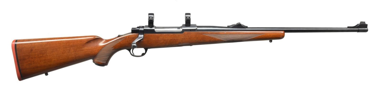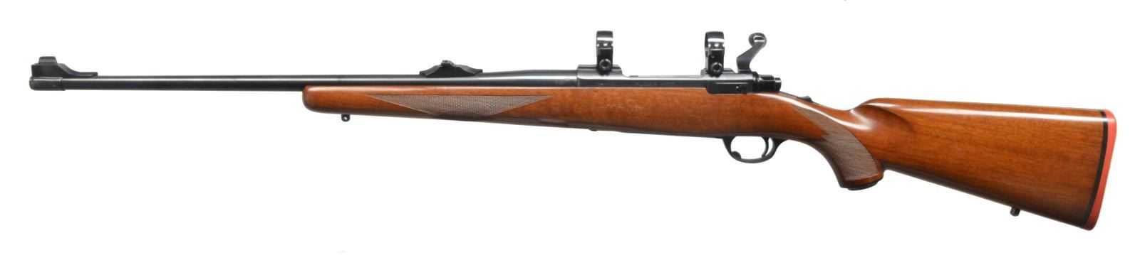 Cal. 7x57. S# 70-24963. Bbl. 22” rnd. Band front w/ bead sight. Screwed on island rear w/ flip up adj. sight. Receiver cut for Ruger rings, installed. Checkered stock & checkered pistol grip. Black grip cap. Red Ruger recoil pad. Sling swivels installed. Bolt has etched matching number. CONDITION: bbl. retains most of original blue w/ thinning on front sight. Receiver retains original blue w/ minor thinning on sharp edges. Floorplate & trigger guard retain original finish w/ a couple of dings. Bolt handle is slightly starting to thin. Stock has original finish w/ some minor rub marks & good checkering. Bore is good. (20-4149/BT). MODERN. $1,000-1,500.