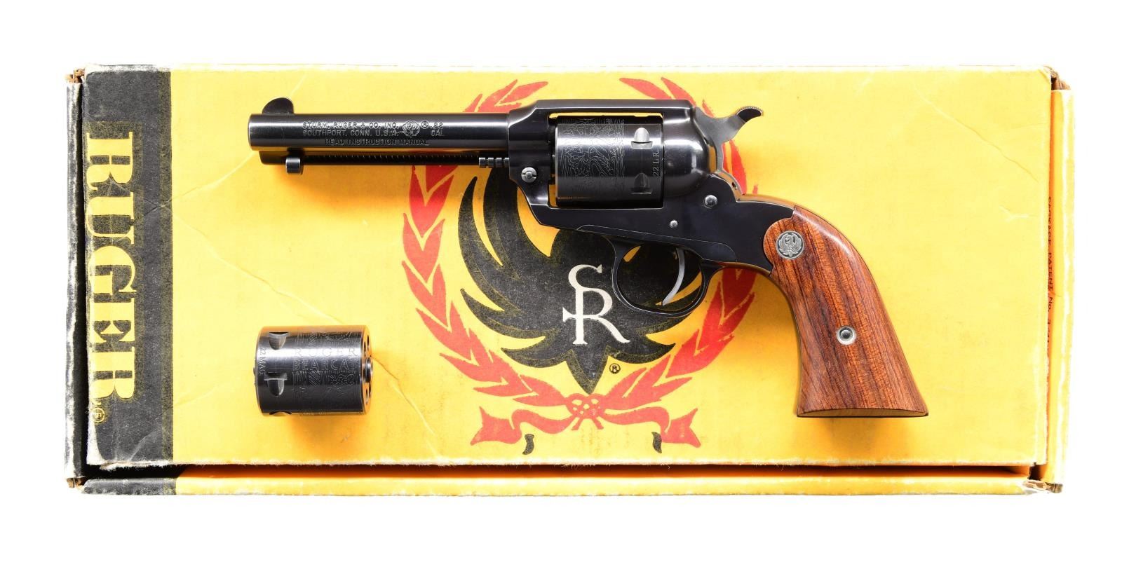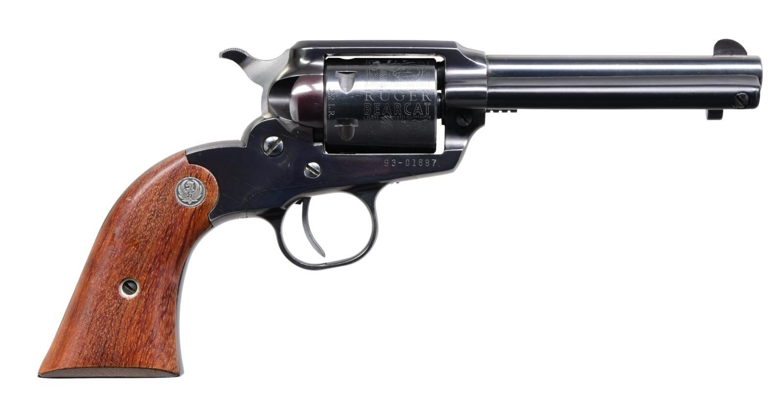 Cal. 22 LR / 22 Mag. S# 93-01687. Bbl. 4" with blade sight plus frame notched rear. Mfg. 1994 (1993-1994 only) with blued steel construction as opposed to alloy frames of Old Model Bearcats; alloy ejector rod housing. Approximately 1,000 NM Bearcat convertibles were made before Ruger ceased its production due to some perceived design flaw, causing them to recall all examples; when recalled, they retained the 22-mag. cylinder and issued a credit voucher. Resources estimate only 300 originals are currently in existence, making this one of the scarcest Ruger handguns. Each unfluted cylinder has the last 3 digits of the serial number electro-engraved on their faces and is identically roll-marked along with the caliber designation. Transfer bar safety system is incorporated. Smooth rosewood grips with small silver eagle medallions plus a blued grip screw in silver bushings. UNATTACHED ACCESSORIES: a good (shop-worn) box that appears to be original, but a cardboard shipping sleeve that was stamped with the firearm's information is missing. Original matching-numbered auxiliary 22-mag. cylinder. Regular current production New Model Bearcat Manual (2004) without convertible markings. CONDITION: very good overall, with faint marks to include cylinder turn lines. There appears to be a slight extra polish on the factory-quality refinish. Very faint marks on the left grip (right is near excellent). Near-excellent bore and minimal firing residue in the frame. (24-6583/NW). MODERN. $800-1,200.