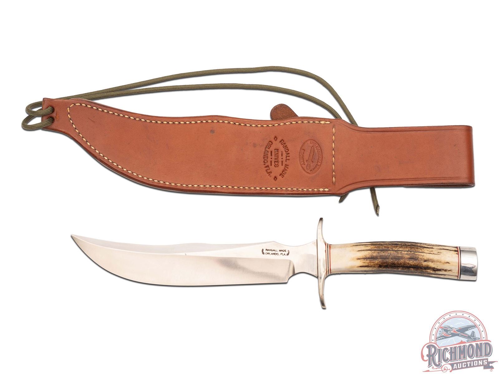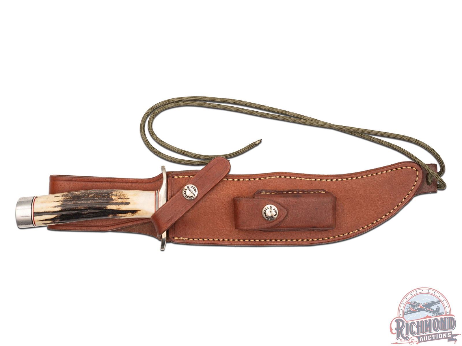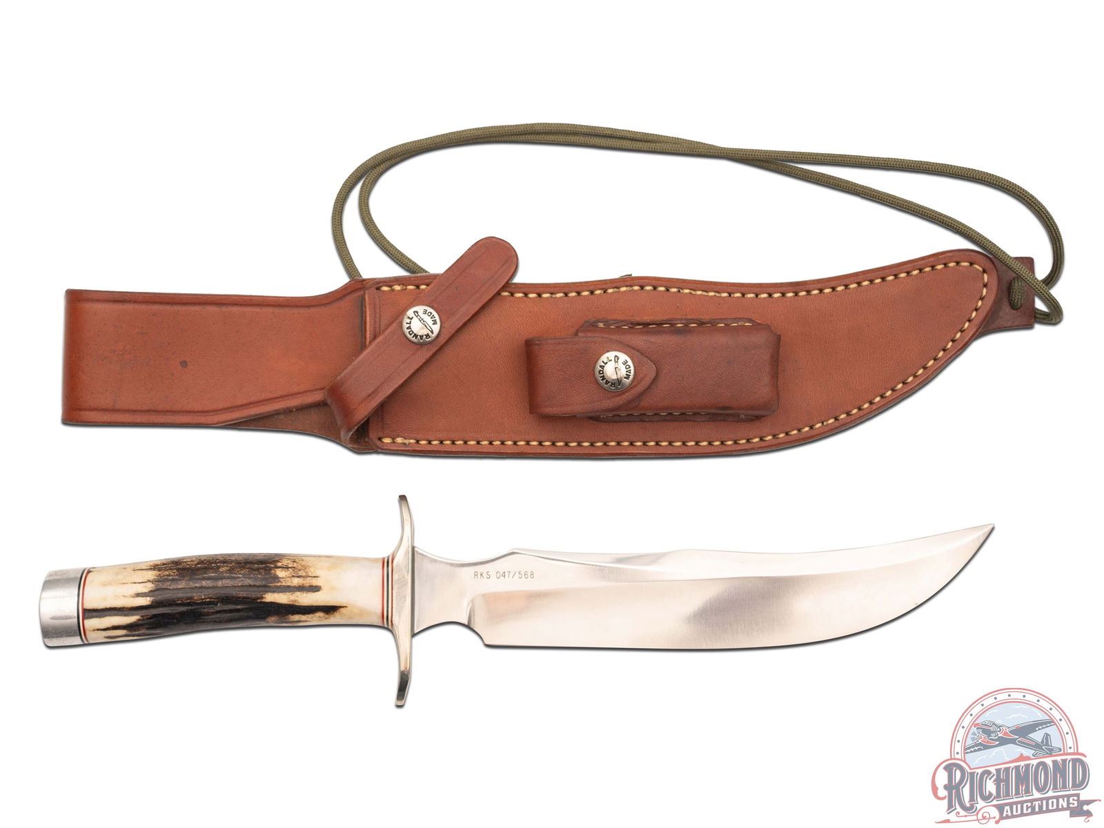 Made for Randall Knife Society Club Members only! Numbered and stamped on the back of the blade "RKS 047 / 568". This is the Club #4 knife that sold out shortly after its release. Per the RKS website; Gary Randall is calling this knife the Model 4, 8 inch Fighter. Features an 8" curved blade and double-sided nickel silver hilt. Stag handle with red and white separations on top and bottom and fitted with a Duralumin butt cap. Includes factory Model A leather sheath with logo snaps, leg paracord strap and hone pocket. Honing block included. Back of the sheath is stamped with "The Randall Knife Society" above the factory stamping.