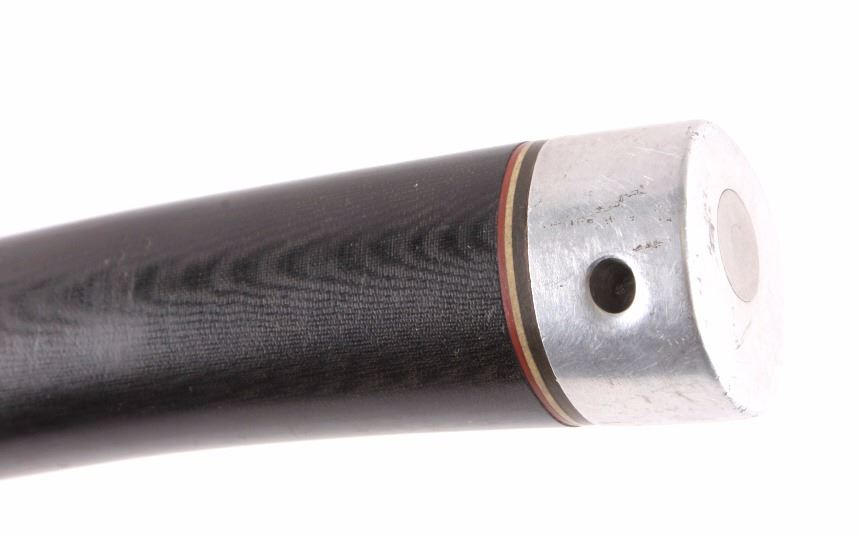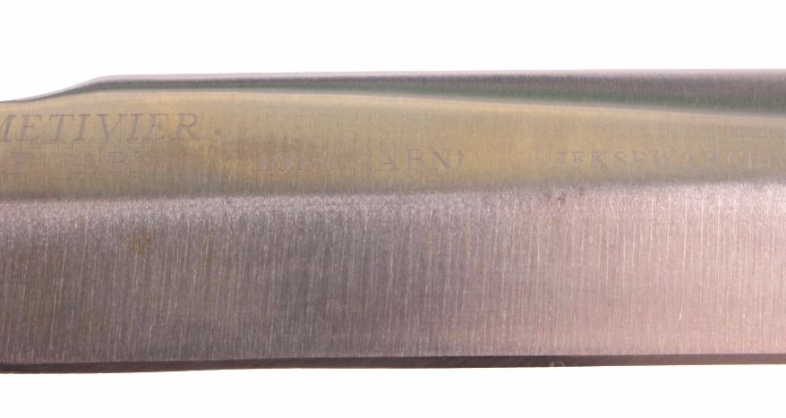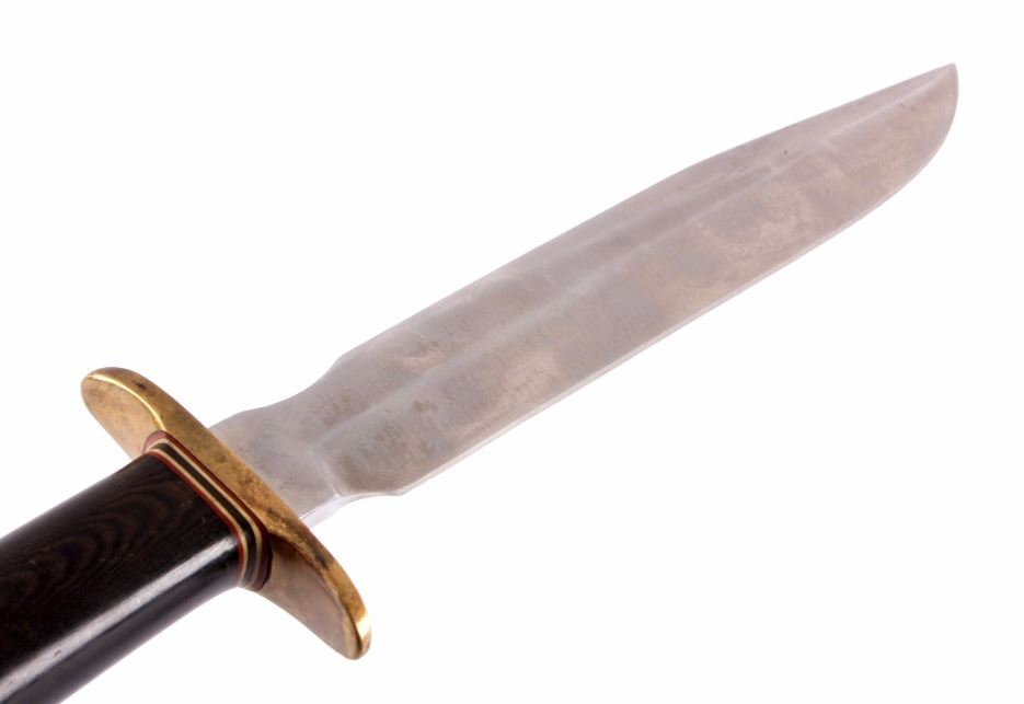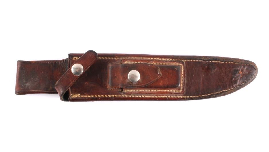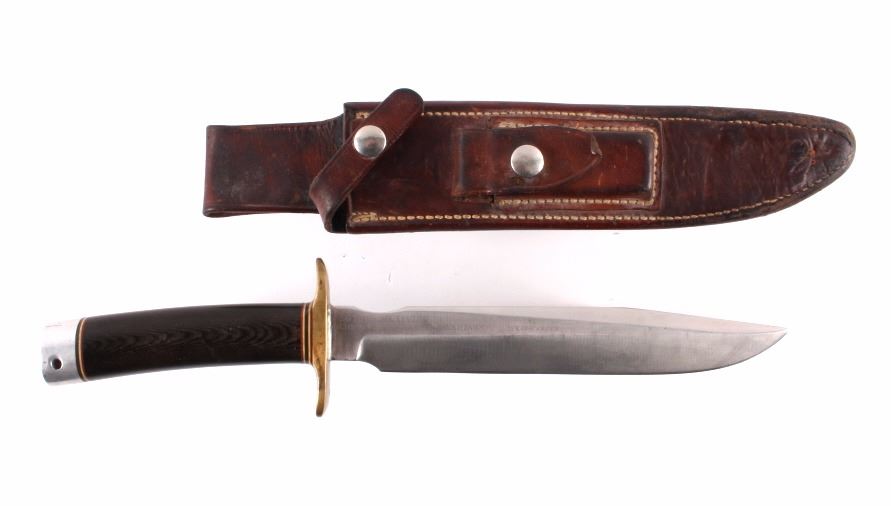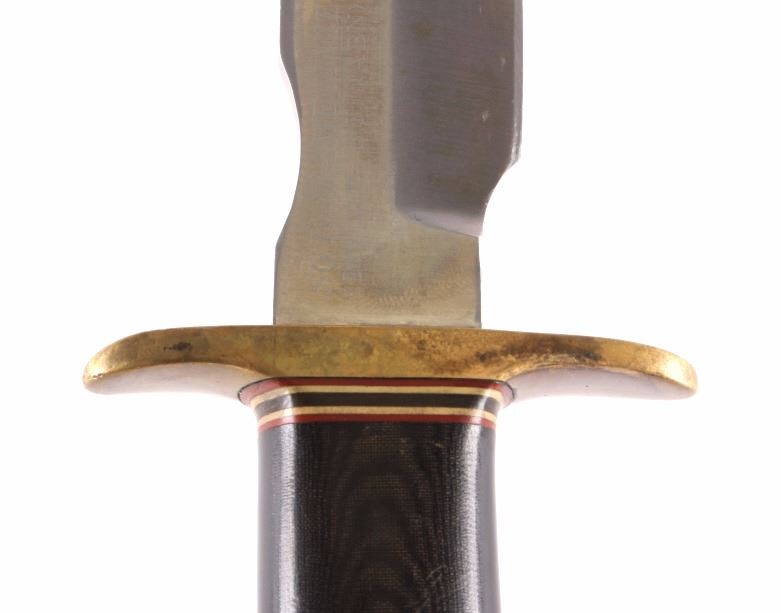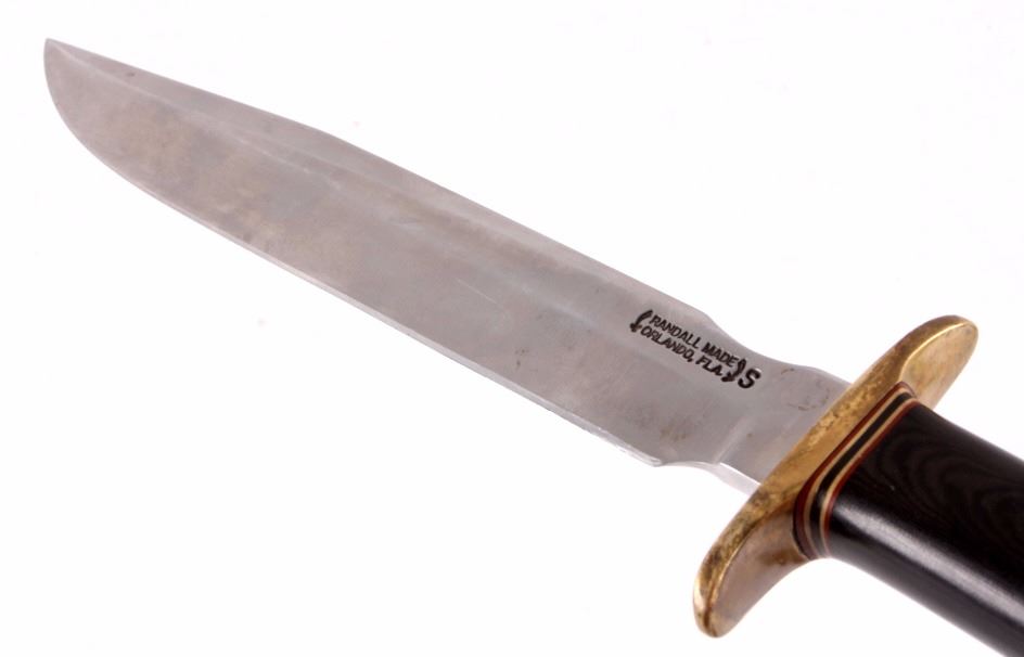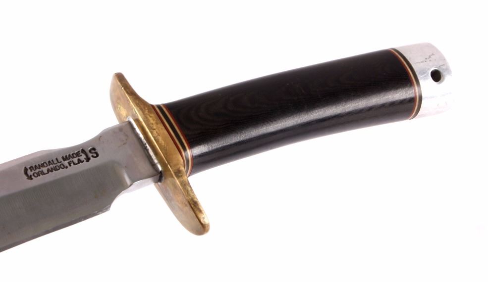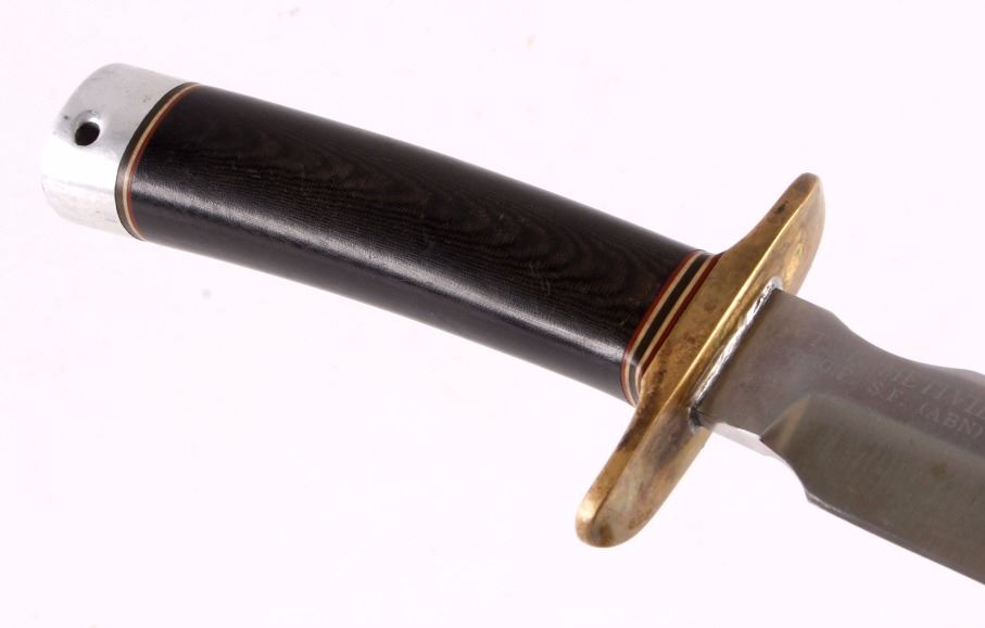 This is a RARE Randall U.S. military special forces fighting combat knife and leather scabbard from circa 1967. The knife has a hardened steel drop point blade. One side of the blade is marked "Randall Made Orlando, Fla." inside two upturned swords with an "S" on the outside. The other side of the blade is inscribed "Sgt. T. Metivier / 12th G.P. S.F. (ABN) 101st (ABN) JFKSPWARCEN". The handle shows a solid brass crosspiece with an aluminum rear bolster. The knife comes with the original leather scabbard. The scabbard features a built in holster for the sharpening stone and is marked on the belt loop "Randall Made Knives Orlando, FL" and "8". This is a RARE and important Randall knife. The knife and scabbard are in good condition. The knife measures 12.75" with an 8" blade.