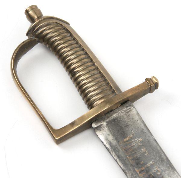 18TH Century Sardinian Naval cutlass with one piece French style brass hilt. Broad curving blade, measuring just over 24 inches, with broad fuller. Blade is engraved "VIVE LE ROY SARDAIGNE" (long live the king of Sardinia). Opposite surface of blade is engraved with the coat of arms of the House of Savoy, the ruling family of the Kingdom of Sardinia. Blade has a good patina, with evidence of the past pitting typical of Naval blades. No scabbard. Overall very good condition, with copy of COA.
