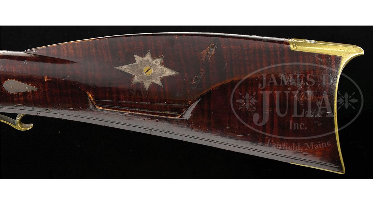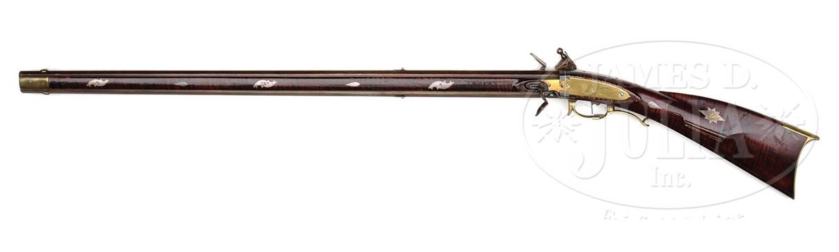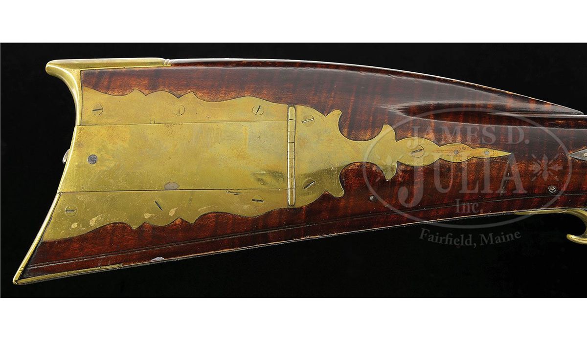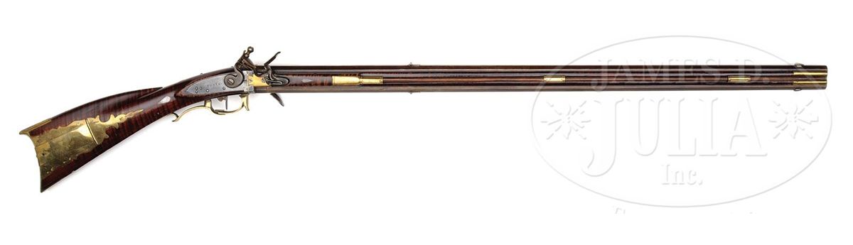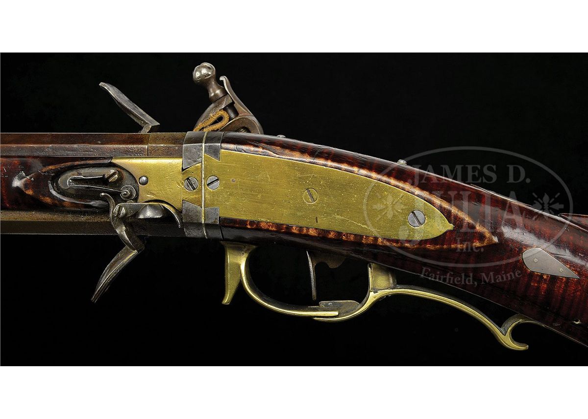 NSN. Two over and under 3/4" full oct rifled 36 Cal. bbls both of which are stamped "D. Boyer". Bbls have full wood paneling on both sides. Flint lock plate is also stamped "D. Boyer". Stock wood is all very nice curly maple and the rifle has eleven silver inlays. Full side plate is brass as is the 4-1/2" figured brass toeplate. Bbls are swiveled by caulking the hammer and pulling back on the trigger guard. Four piece patchbox in Boyer's traditional style is similar to those used by Pannabecker. David Boyer was born in Berks County and is listed as a gunsmith in Orwigsburg, Schuylkill County circa 1836-1840. It is very rare and unusual to find any later period flintlock swivel breech guns with full wood paneling. CONDITION: Curly maple wood on the stock is in wonderful condition with its original finish and there is no evidence of any repairs or restoration on the gun. Ramrod is a replacement. 4-48323 RG65