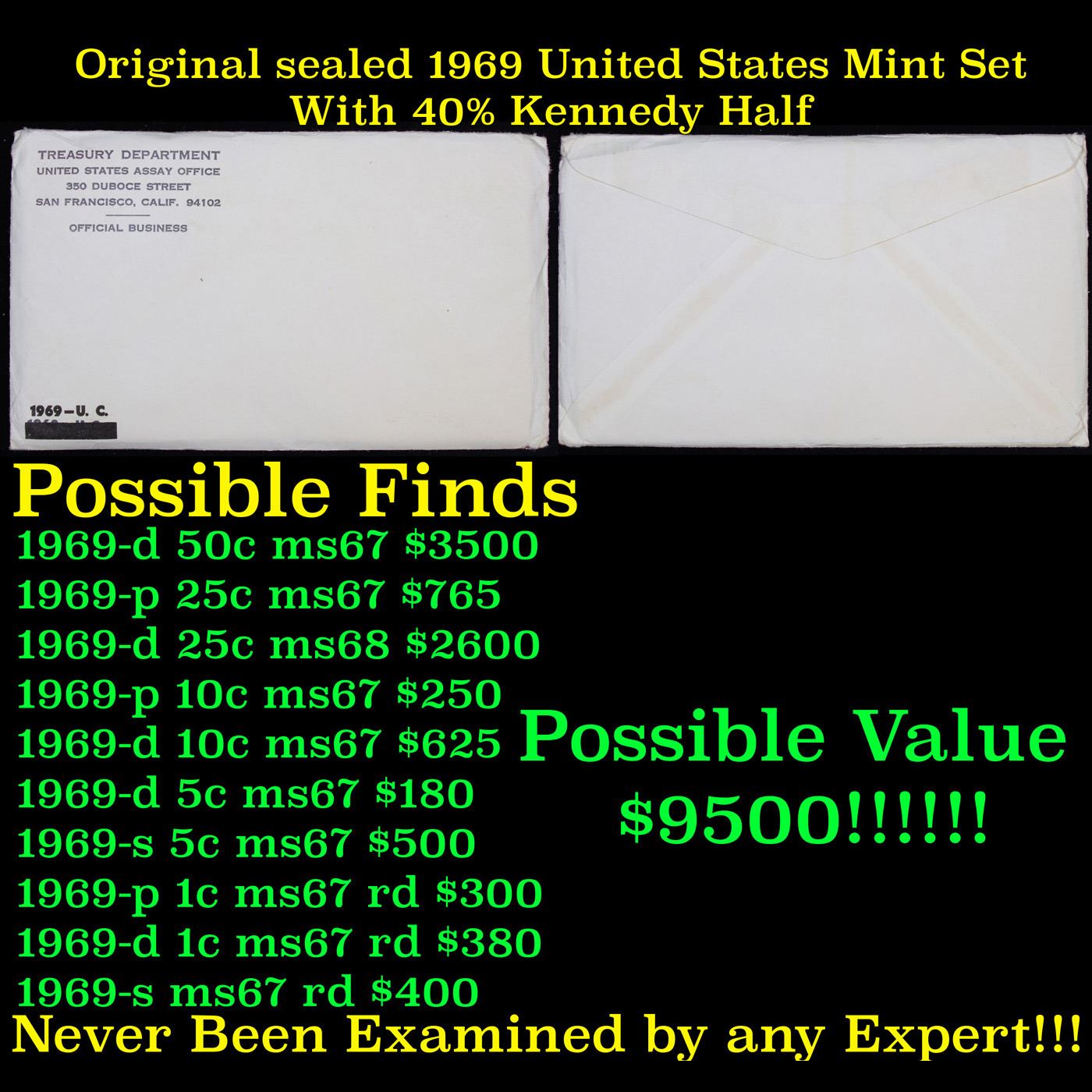 RARE SEALED United States Mint Set 1969 40% Kennedy Half . This is a rare SEALED United States Mint Set. The year 1969. These set is sealed, has never been opened and is just as it left the mint when it was minted. The set includes 10 coins the full p & d run. The set has a 40% Kennedy Half Dollar and the 's' mint penny. The 1969-d Kennedy 50c in ms67 trends $3500, a 1969-p Washington 25c in ms67 trends $765, a 1969-d Washington 25c in ms68 trends $2600, a 1969-p Roosevelt 10c in ms67 trends $250, a 1969-d Roosevelt 10c in ms67 FT trends $625, a 1969-d Jefferson 5c in ms67 trends $180, a 1969-s Jefferson 5c in ms67 trends $500, a 1969-p Lincoln 1c in ms67 RD trends $300, a 1969-d Lincoln 1c in ms67 RD trends $380, and a 1969-s Lincoln 1c in ms67 RD trends $400. Possible value in this mint set is $9500.