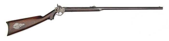 SHARPS PISTOL CARBINE SN 459. Cal. 41 Mule-Ear. Rare little rifle with 27-1/2in rnd bbl, dovetail front sight with narrow blade & patented miniature musket style rear sight with ski jump style elevation notches. Rifle is built on a small frame pistol action with left side marked ~SHARPS & Co PHILADa, PA.~. Right side is set up for the disc primer feed. Mounted with uncheckered straight grain American walnut with long rnd forearm that has a steel schnable tip screwed to the bbl. Stock has pistol grip with steel oval grip cap and semi-crescent steel buttplate and a 2-pc patchbox on the right side. Receiver has full coverage Gustave Young engraving consisting of intertwined foliate arabesque patterns with punch dot background. Hammer, forend cap, buttplate tang and patchbox are engraved to match. According to Sharps Firearms, Sellers, only about 550 of these rare rifles were produced in the short time frame of 1857-1860. They were available with three types of cartridges - paper, wire ejector and mule-ear and two different frame sizes, making this an extremely rare Sharps rifle. CONDITION: About fine. Bbl retains most of its dark brown finish/patina with cleaned areas on both sides forward of the forearm and over the chamber area. Receiver has smoky case colors behind the hammer, otherwise colors are faded to silver & gray. Forend cap, buttplate & patchbox are also gray metal patina. Wood is sound with light nicks & dings and retains a very old restored finish. Mechanics are fine, bright shiny bore, dark in the grooves.