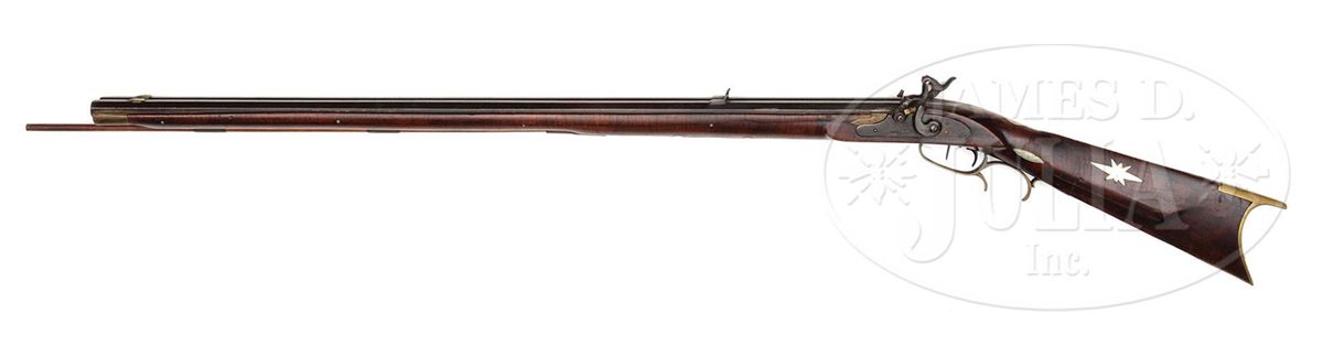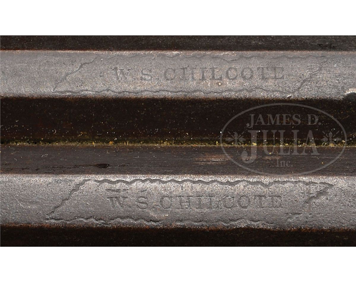 NSN. This gun has two side by side 35" full oct bbls. Left bbl is 40 Cal. rifled and the right bbl is 40 Cal. smooth. Both bbls are signed "W. S. Chilcote". Full stock is curly maple. Gun has 5-1/4" silver saddleplate. Each of the two percussion locks are marked "Leman Lancaster". Each lock has a brass inlay forward of the lock to prevent the wood from being eaten away by the fulminated mercury in the percussion caps. Gun has four silver inlays which include the eight-pointed silver star on the cheek. Gun has an engraved cap box set into a large brass scalloped inlay. Gun has double set triggers with one of the triggers firing each of the bbls. Willaim S. Chilcott worked in Houstontown, PA, Fulton County in the 1870's and 1880's. This should be a very desirable gun for the collector who is searching for one of a kind items. CONDITION: Gun appears to be in good original condition throughout. Locks need some adjustment. 4-49145 RG72