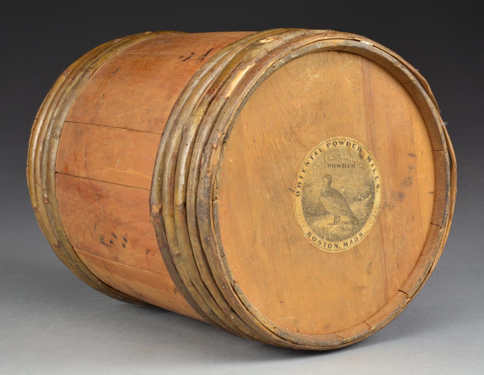 ME. POWDER KEG. The Oriental Powder Co. manufactured gun powder & was one of the four largest suppliers to the Union forces throughout the American Civil War. The wooden Oriental Western Sporting Company powder keg has an original lithograph label w/ gilt lettering which reads “ORIENTAL POWDER MILLS BOSTON MASS” around the border of the label. The inside of the label features a grouse beneath “WESTERN SPORTING POWDER”. The keg of wood construction w/ wood & bark staves. The end of the keg w/ threaded wooden plug w/ remnants of an additional old label. SIZE: 13" l x 10" diameter. CONDITION: keg retains all original surfaces & original label on top & bottom. The Powder Mills label is in good condition w/ some creasing, otherwise very good. The threaded plug is intact. The bark wrappings have some slight damage; minimal in nature, due to dryness. This is really a wonderful, well preserved example & is quite rare. (02-14686). $1,000-1,500.