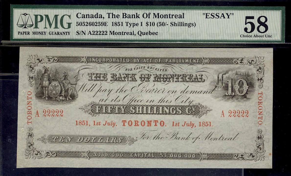 RARE SOLID NUMBERED Bank of Montreal note! Bank of Montreal 1851 $10 (50/-Shillings) Type I #A22222 PMG CH AU58. Very Rare solid number issue.