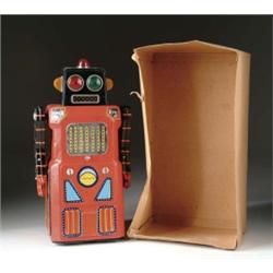 RARE SONIC ROBOT W/ ORIGINAL BOX BOTTOM. Part of the famed "Gang of 5", commonly referred to as the "Train Robot" because of the whistles that it emits from its chrome grille/speaker as it rolls across the floor in stop and go action. Black litho head and red body with lithographed panels. Eyes light up and arms sway. A very desirable addition to anyone's fine robot collection. SIZE: 15 1/2” t. CONDITION: One battery tang is missing, so working condition is unknown, otherwise visually in very good to excellent condition with a couple small light scratches. Box bottom is good to very good. 1-3367 (3,500-5,500)