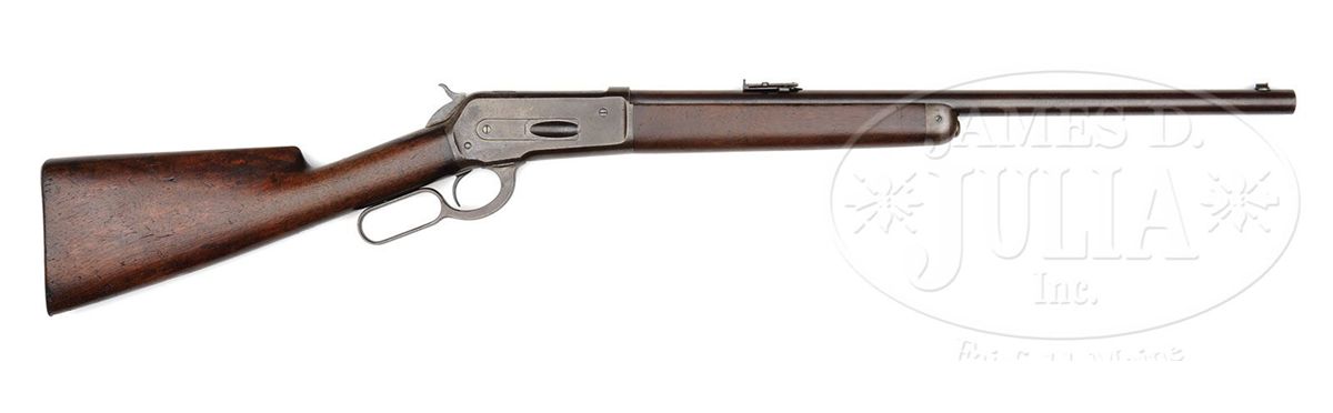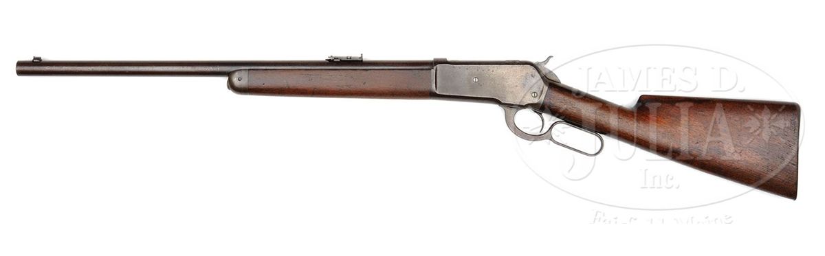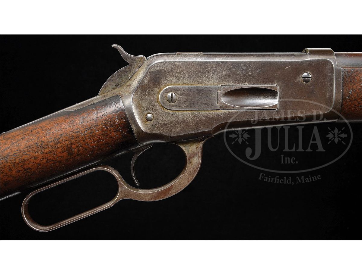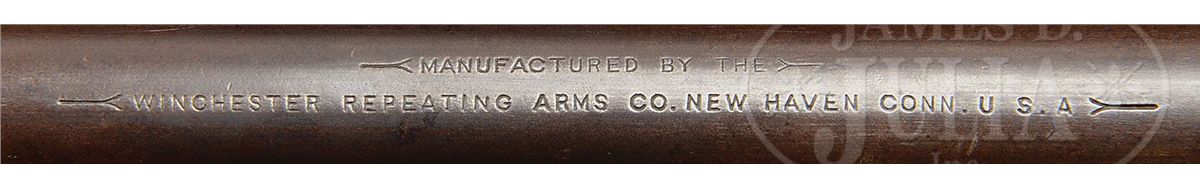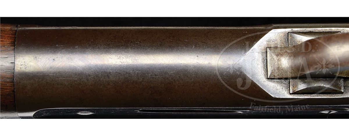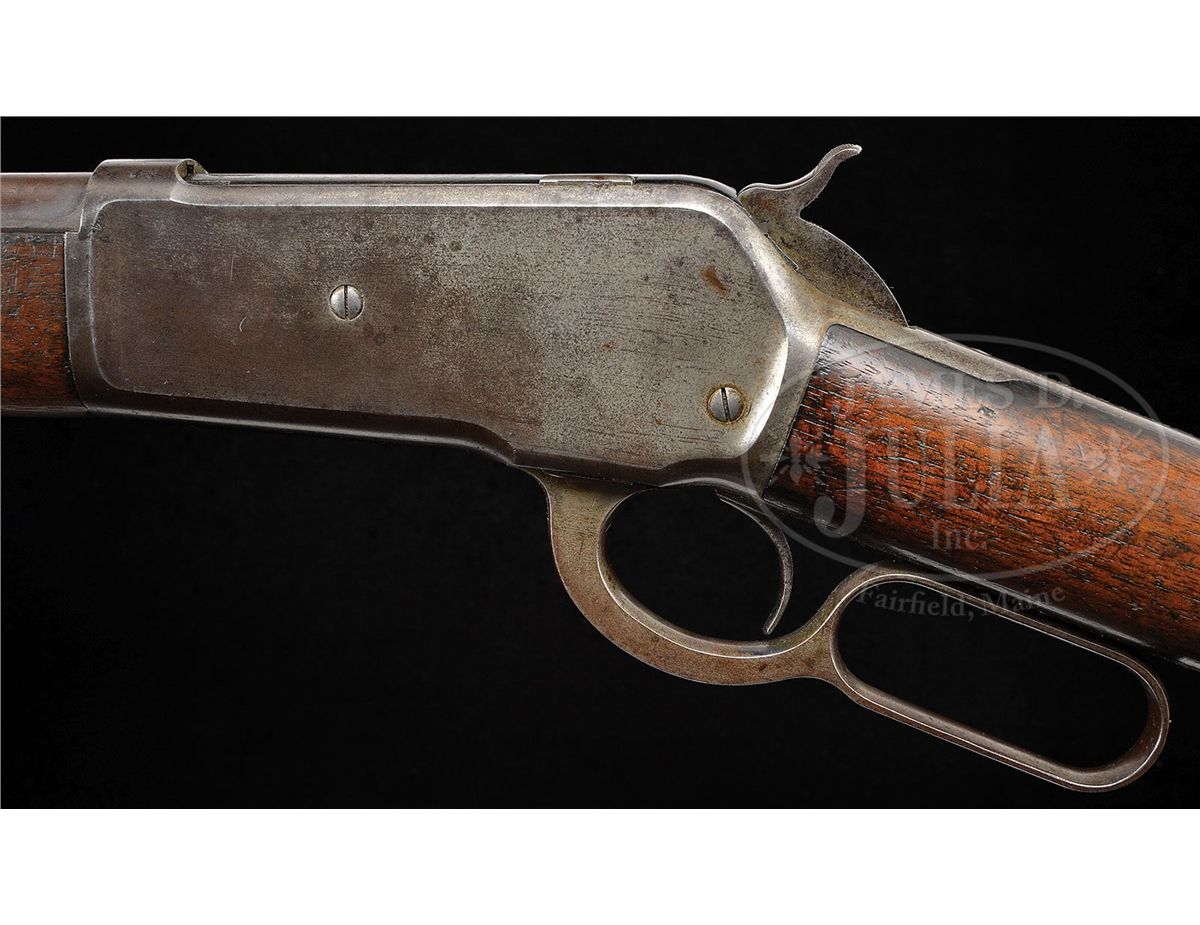 SN 42801. Cal. 50 Ex. (50-110). Standard grade rifle with 22" rnd bbl, button magazine with altered Lyman Jack front sight and 900-yard carbine ladder rear sight. Mounted with uncheckered, straight grain American walnut with straight stock & smooth steel shotgun buttplate. Accompanied by a Cody Firearms Museum letter which identifies this rifle in caliber 50-110 with 22" rnd bbl, plain trigger, half magazine, shotgun butt, "8 pounds" and "comment: 'standard sights', (point blank 150 yards)", received in warehouse May 27, 1890 and shipped June 6, 1890 to Order #12695. This rifle is somewhat unusual, not only from the aspect of the 22" bbl & button magazine but the fact that it is not British proofed. A large proportion of similar configuration '86s examined by this cataloger are British proofed for the India & Africa markets. CONDITION: Very good. Bbl retains blue in the most sheltered areas being mostly a blue/brown patina with several small nicks over the top and both sides and a few small spots of pitting on the left side over the forearm area; receiver retains about 40% silvered case colors with the balance turned dark; lever & hammer retain faded case colors. Wood is sound with the stock retaining about 40-50% thin orig finish and the balance of the wood a hand-worn patina. Mechanics are fine, sharp bright bore with moderate pitting. 4-47639 JR151