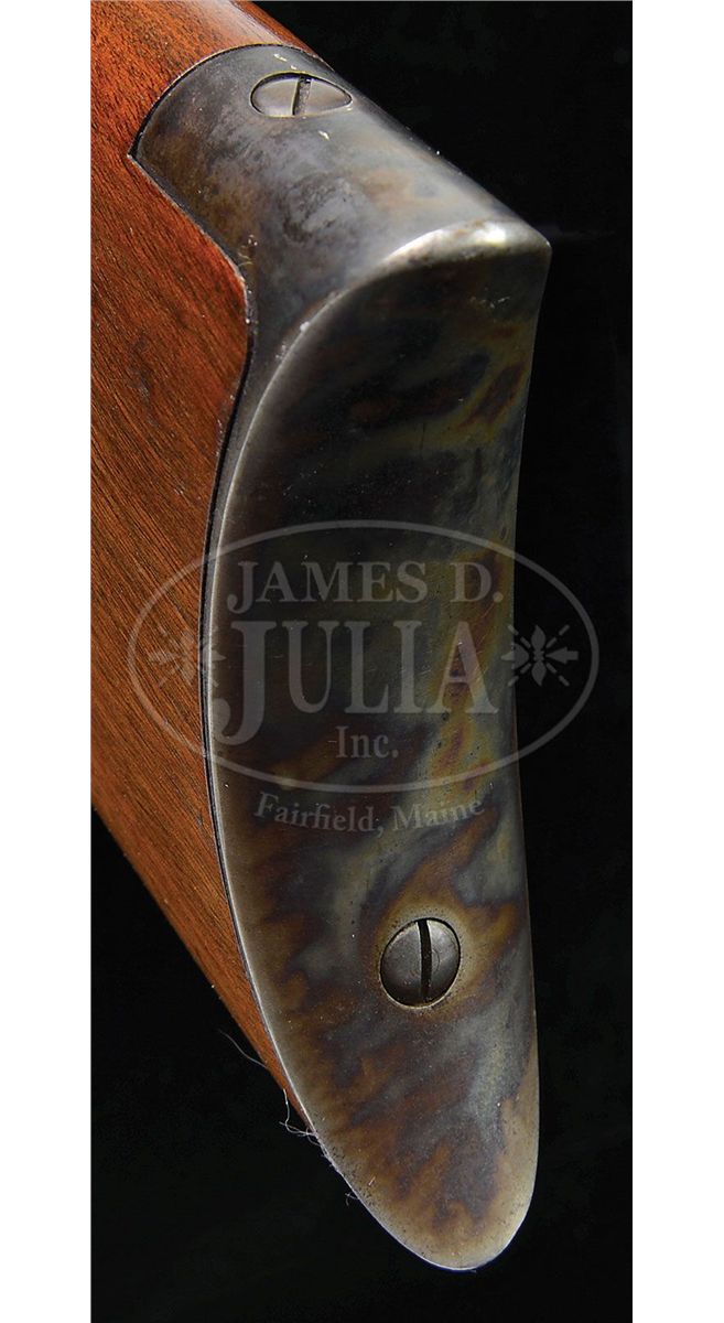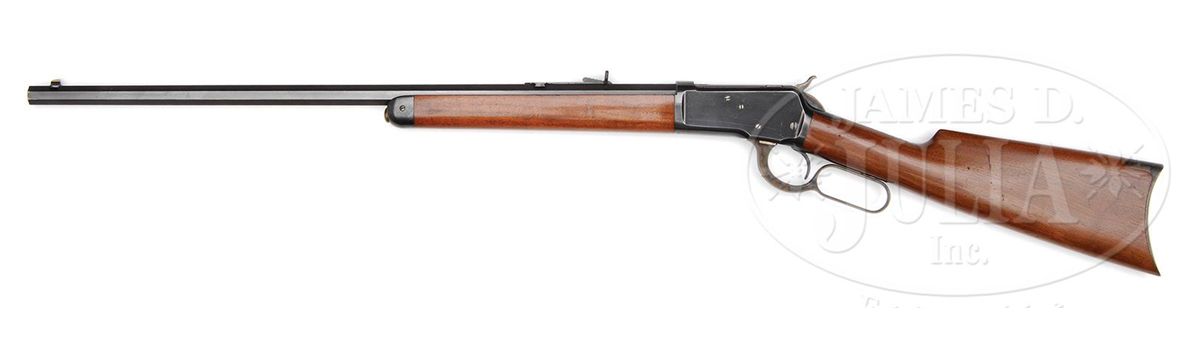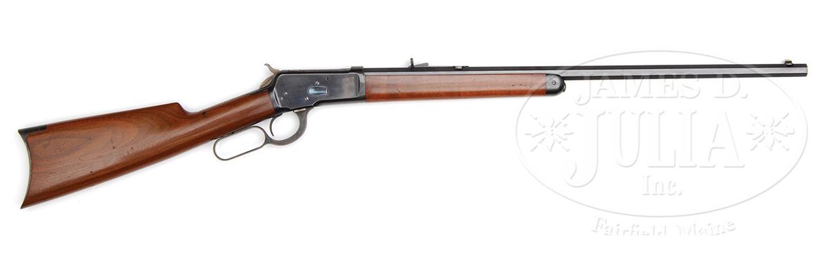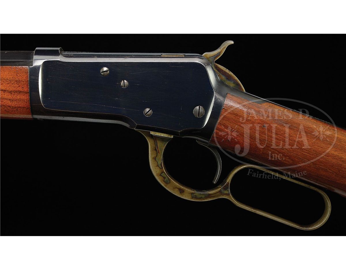 SN 12197. Cal. 44 WCF (44-40). Standard grade rifle with 24-1/4" oct bbl, button magazine, half nickel front sight and semi-buckhorn rear sight. Mounted with uncheckered straight grain American walnut with straight stock and crescent buttplate. Accompanied by a Cody Firearms Museum letter which identifies this rifle, as found, received in warehouse June 23, 1893 and shipped same day to Order #19941. Almost any special order feature found on a Model '92 is scarce and in some cases very rare. PROVENANCE: Wes Adams Estate Collection. CONDITION: Extremely fine plus. Bbl retains 98-99% crisp orig blue with faint sharp edge wear; receiver retains about 98-99% blue with some minor candy striping on the sides, very light sharp edge wear and light thinning on the bottom; lever, hammer & buttplate retain about all of their bright, orig case colors, moderately faded on outer faces of the lever and lightly faded on the buttplate. Wood is sound with a few scattered light nicks & scratches on buttstock with one repaired small gouge by the top tang and overall retains about all of its orig factory finish. Mechanics are crisp, brilliant shiny bore. Rifle may have been fired but if so, very little, as the bolt face & loading gate retain about all of their orig finish. A truly outstanding special order '92. 4-44608 JR51