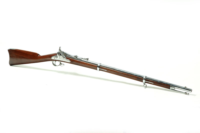 .50 caliber, breechblock with eagle and 1866, lock plate dated 1864, 32" round barrel, nickel-plated for use by the color guard, walnut stock.