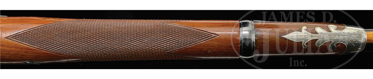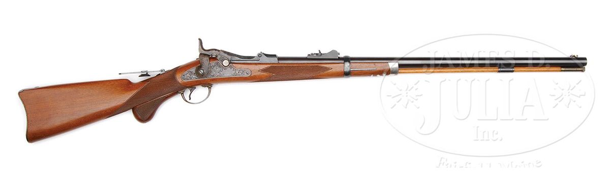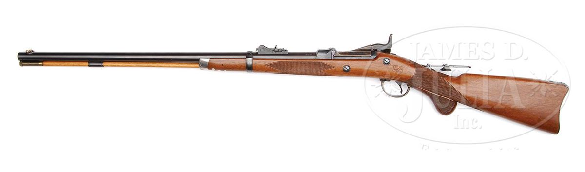 Cal. 45-70. Beautiful Officer's Model Springfield, Type III with 26" bbl, gold washed Beach combination front sight and ski jump 1200 yard ladder rear sight marked with an "R" on left side. Bottom of bbl has a sgl blued steel guide and locator post containing its orig brass tipped hickory cleaning rod. Bbl has the usual "V,P" and eagle proofs along with additional "R" and "P" proofs. Breech block has the "US / MODEL / 1873" markings and lockplate has standard eagle and "US / SPRINGFIELD" markings. Mounted in a straight grain half stock with extensively checkered forestock & straight grip with orig 1873 style buttplate without trap and has a sgl bbl band. Forend tip is inlaid with a beautiful silver plated pewter cap with foliate patterns on the bottom. Top of the wrist is inlaid with the standard tang sight inletted directly into the wood. Left side of wrist has a crisp "SWP / 1885" cartouche. Trigger guard is 2-pc with a sgl set trigger and bottom of wrist has its orig separate checkered walnut finger rest. Lockplate, hammer, breech block, top tang, top front of receiver, bbl band, trigger bow, buttplate tang & forend cap are all nicely engraved in standard patterns. According to The .45-70 Springfield Book II 1865-1893, Frasca, there were 477 of these rifles produced in the period 1875-1885. One hundred and one of those rifles were issued to various military officers and important civilians with about another 300 of them purchased by military officers. It is further believed that another 25 of these rifles were shipped to San Antonio Arsenal for issue to military officers, which leaves about 50 unaccounted for and it is believed were possibly sold to private companies in 1893. A chart on p. 191 of the referenced publication shows that there were 100 of the Type III rifles produced only in the 4th quarter, April to June, 1885. That apparently was the last production of the Officer's Model rifle although records show that they were still being sold in 1900. This rifle is one of the finest extant. CONDITION: Extraordinarily fine, appears to be new & unfired retaining virtually all of its orig arsenal finish to both metal & wood with strong bright blue, brilliant case colors and bright varnished stock; cleaning rod is equally new. Mechanics are crisp, brilliant shiny bore. 4-47526 JR185