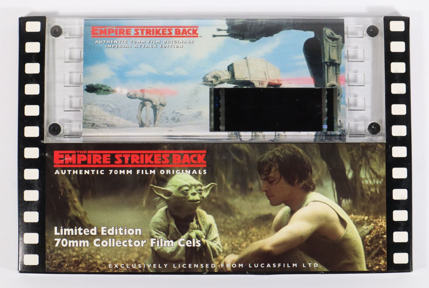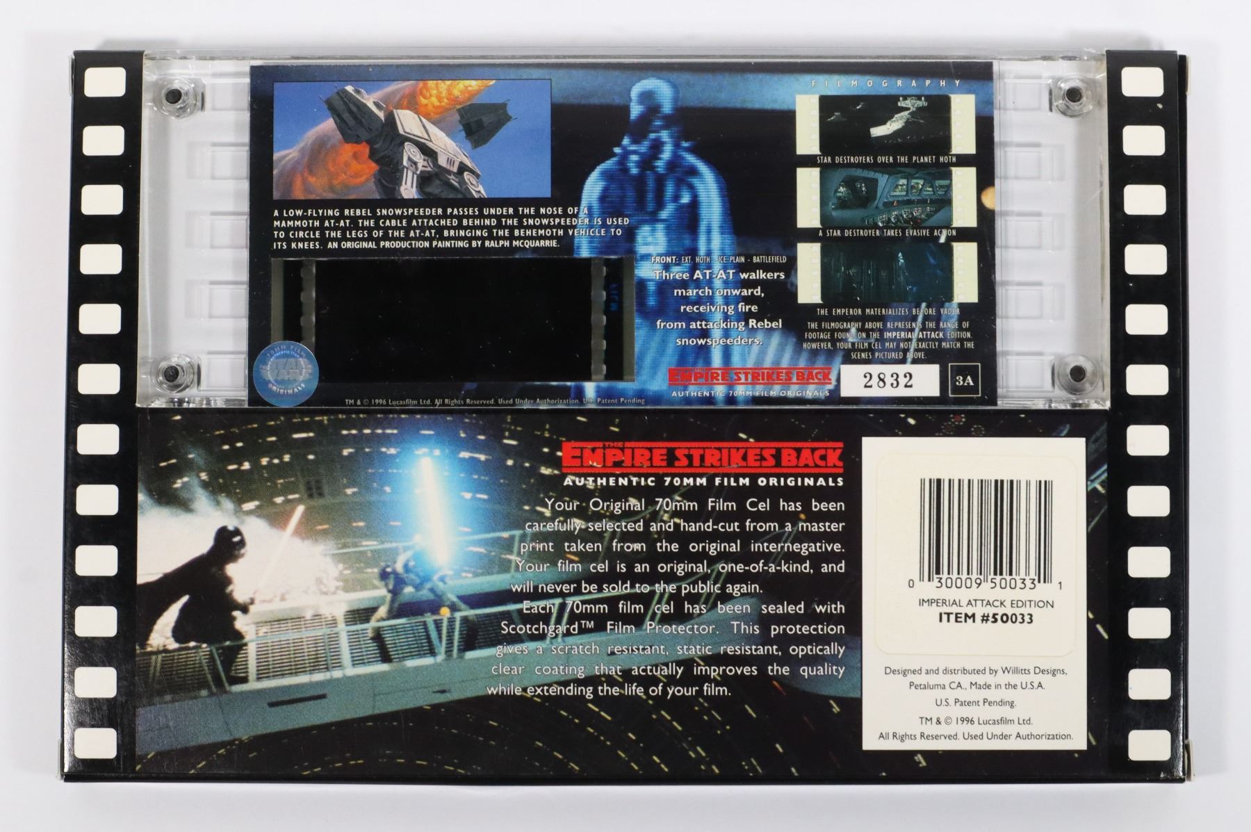 FILM CELS - THE EMPIRE STRIKES BACK. . WILLITTS DESIGNS: HARD TO FIND OFFICIALLY LICENSED 70MM FILM CELL HAND CUT FROM A MASTER PRINT AND EACH IS ONE OF A KIND. THE FILM CEL IS ENCASED IN AN ACRYLIC BOX WITH AN EXPLANATION OF THE MOVIE SCENE