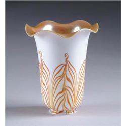 Lot 205 RARE STEUBEN HOOKED FEATHER SHADE Very rare Steuben shade R#213 has red hooked feather against calcite with ruffled bottom. Interior is gold iridescence shading to yellow at fitter. Signed in fitter with silver Fleur-de-Lis mark. SIZE: 7-1/4” x 5-3/4” dia. CONDITION: Chip to ruffled edge of shade. 5-70451