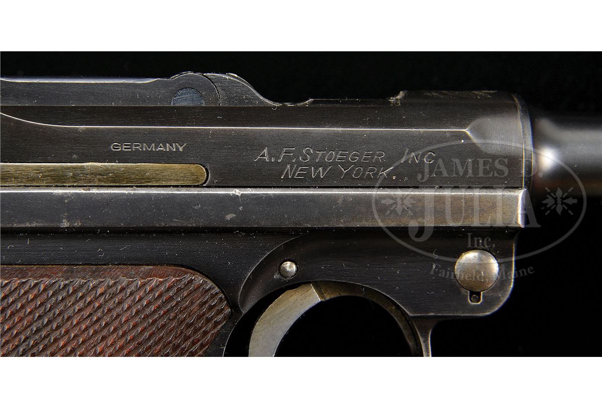 SN 1036u. 6" 9mm Stoeger bbl. American Eagle appears above chamber. "DWM" scroll on center toggle link. 100 meter/200 meter Navy adjustable rear sight. Right side of receiver is "Germany" stamped and has two-line "A.F. Stoeger Inc. / New York" address. Checkered walnut grips. All numbered parts are matching except for the right grip. This gun is featured on pp. 760 and 897 of Dr. Geoffrey Sturgess' The Borchardt & Luger Automatic Pistols. PROVENANCE: Collection of Dr. Geoffrey Sturgess. CONDITION: Excellent. Retains 98% orig blue. 70% orig straw. Bore is bright and sharp. Grips are sharp with very little wear. Magazine is excellent with scattered corrosion on the body. Mechanics are excellent. 4-52803 BWS46
