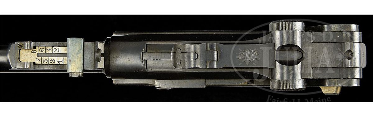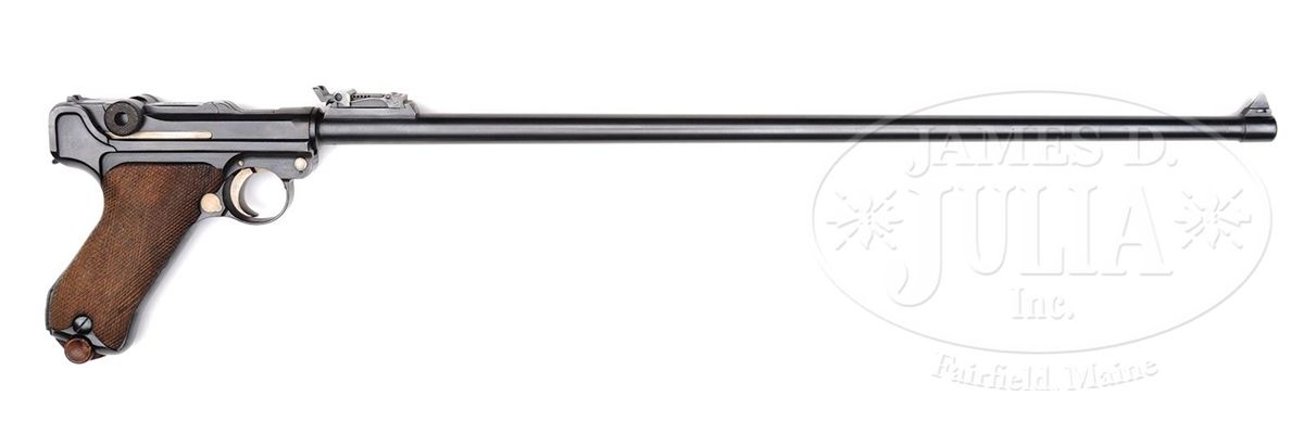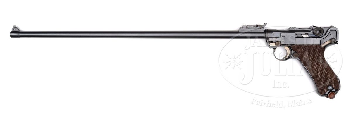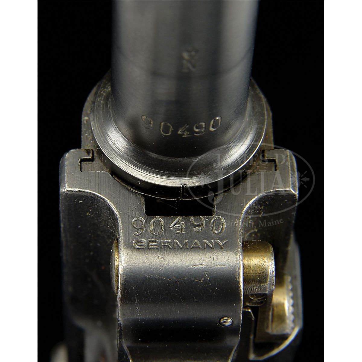 SN 90490. 20" .30 Cal bbl Crown/N proofed and serial numbered to the gun, with a multi position artillery rear sight and special high foresight. "DWM" scroll on center toggle link. Crown/N proof on left side of receiver "SAFE" marked safety and "LOADED" marked extractor. "GERMANY" marked under serial number on front of frame. Checkered walnut grips. Proper plain wood bottom magazine. This is the longest known bbl length in this serial range. These guns with extra-long bbls were fitted with a weak main spring to allow sufficient recoil to cycle the action. This gun is featured on p. 757 of Dr. Geoffrey Sturgess' The Borchardt & Luger Automatic Pistols. PROVENANCE: Collection of Dr. Geoffrey Sturgess. CONDITION: Excellent retaining 98% orig blue and 95% orig straw. Bore is bright and sharp. Grips have light wear with a few minor chips and dings in the checkering. Magazine is excellent with light corrosion on body and minor dings to the wood bottom. Mechanics are excellent. 4-52112 BWS92