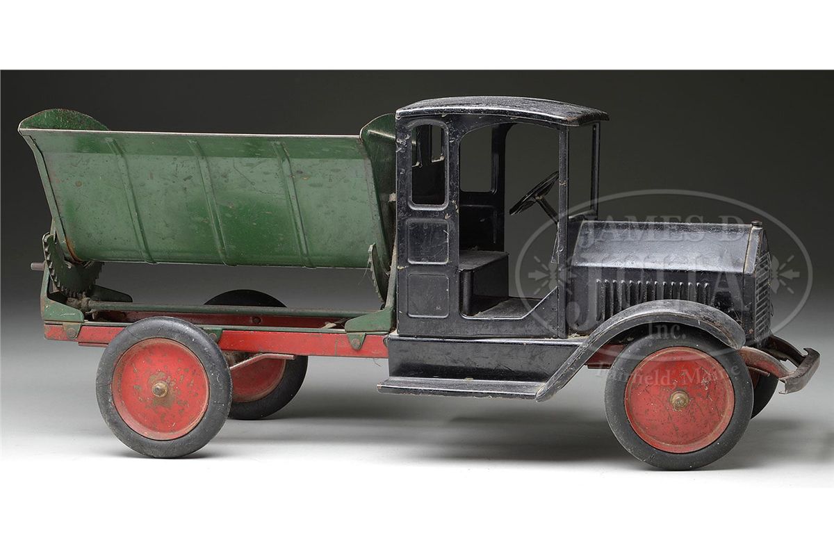 A most unusual and seldom found Sturditoy. This particular vehicle has a hopper bed that by means of a crank can tip to the right or left. Steel disc wheels with thick black rubber tires, black cab, red frame work and a dark green hopper body make quite a contrast as well as intriguing commercial vehicle. Although this truck is in good to very good condition, its rarity is quite high! Of all the various manufacturers of pressed steel toys this is the only version by any maker that utilized this type of mechanism to empty its bed load. Fresh to the market it comes with years of dust and dirt free of charge to the potential buyer. SIZE: 24" l. CONDITION: Overall in good to very good condition. A good cleaning would brighten the paint and the dust and dirt gathered in the corners and crevices would not be such an unsightly matter. 1-13395