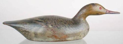 RARE SWIMMING Crowell Merganser hen in wonderful original paint which shows some wear. A couple of teeth marks restored on bill tip. See other photo on our web site. One of his most imaginative designs. Glass eyes. Recently found in a Cape Cod home. Early oval Crowell hot brand on the bottom. (decoy)