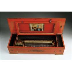 RARE SWISS MUSIC BOX W/ CHINESE DECORATION. Believed to be the only one known, this 13 1/2" cylinder, single comb box is in a reddish/orange case with gilt highlights, carved with an outdoor Chinese court scene in relief on the lid and relief floral decorations on sides. SIZE: 27" w. x 6" h. x 9 1/4" d. CONDITION: Some horizontal splits to lid, areas of paint touch up, and replaced brass front knobs, otherwise very good with nice rich tone. 1-4591 (2,500-4,000)