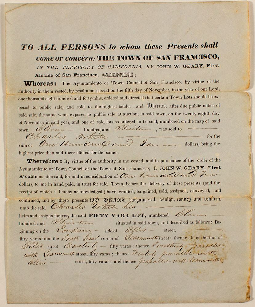 Another Territory of California document! 1849. This is a very rare document announcing the sale at auction of a lot in San Francisco. The document, endorsed by the City's first Alcalde John W. Geary (as in Geary Street), gives the location of the lot as #1113, located on the southern side of Ellis St, 50 varas (33.33') from southeast corner of Leavenworth St. The lot was won at auction by Charles White for the princely sum of $110. This rare old document has some edge issues and is repaired with archive tape on the reverse. It measures 7.25" x 9” and is very clear and bold after all these years.