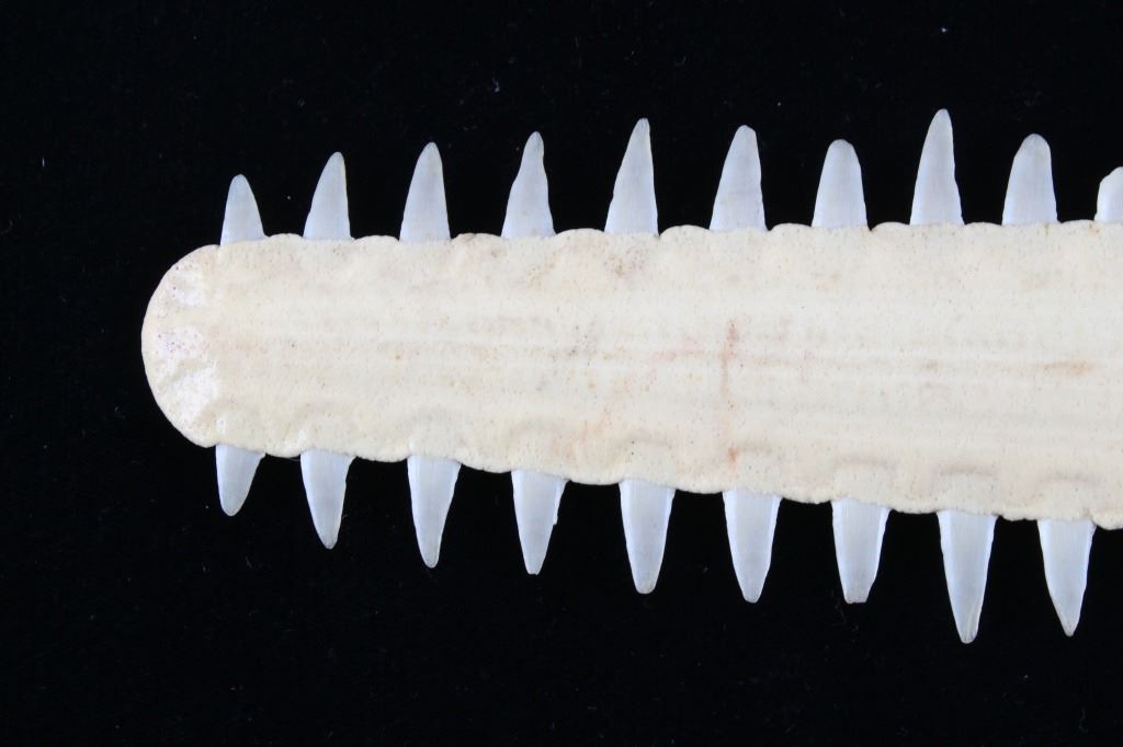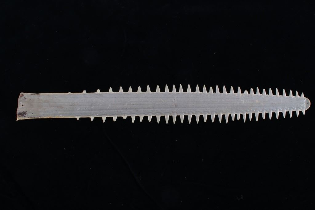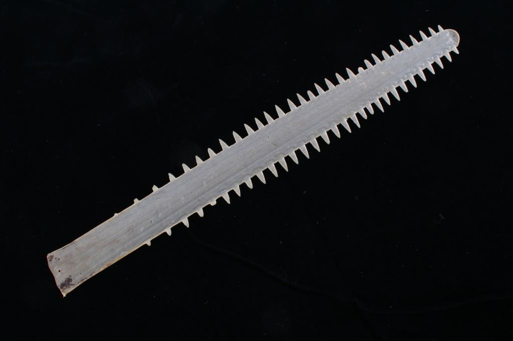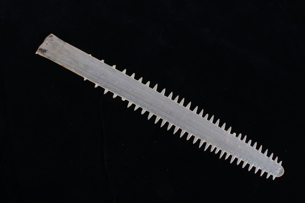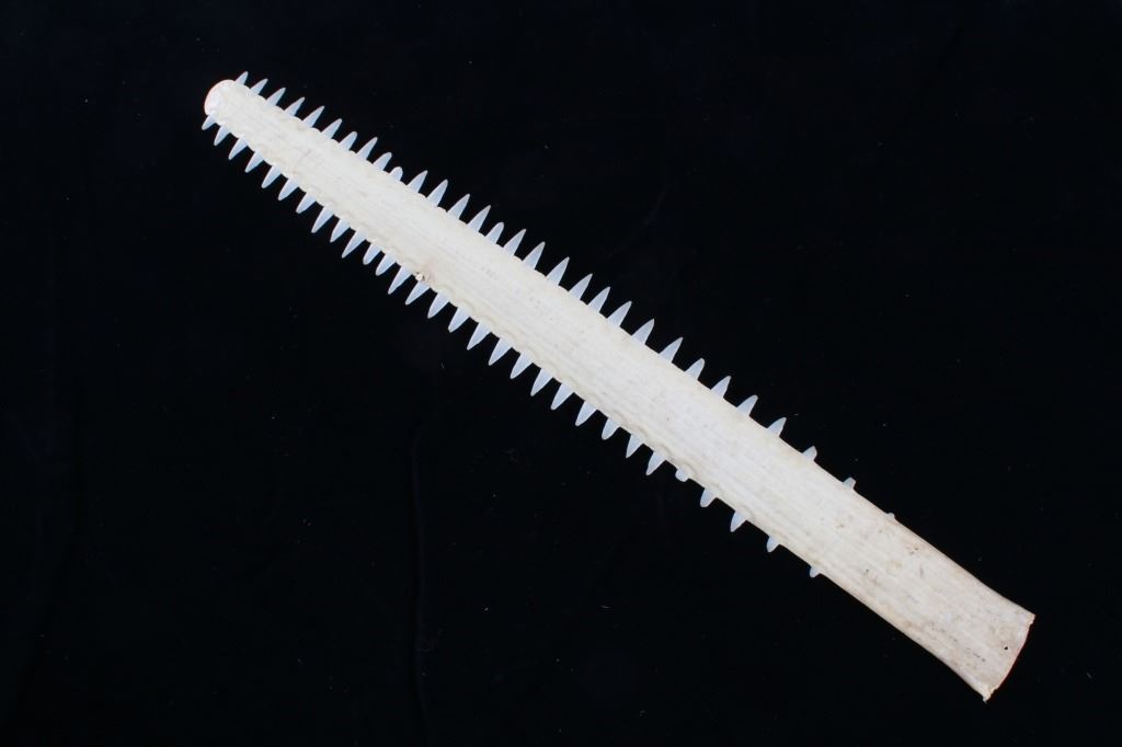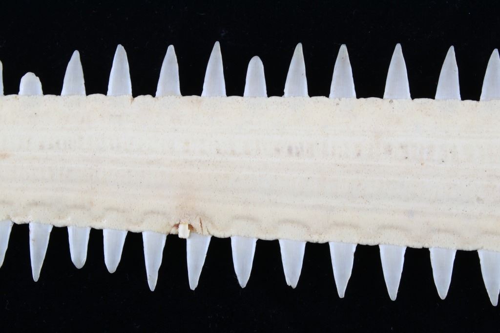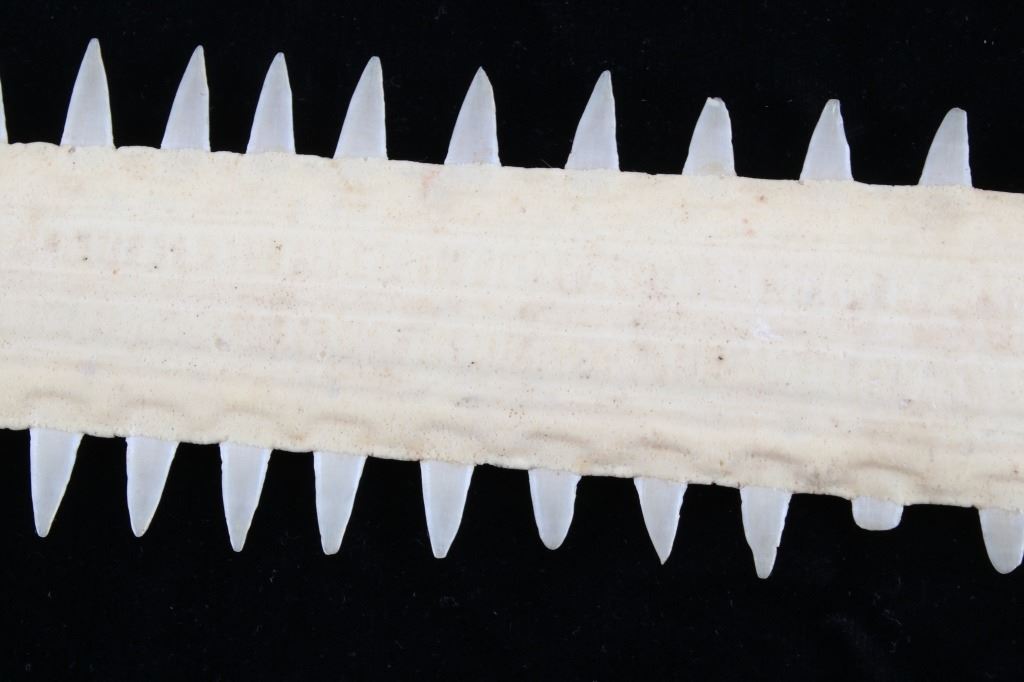 The lot features a fantastic and rare Sawfish Rostrum bill with teeth all the way around the bill. The piece dates to pre-1950 and shows the full bill with grey coloring on one side and the other side a creamy yellow. The bill has teeth all the way around with no apparent missing teeth. This displays wonderfully on your collection shelf of curiosities and is legal to own. Measures overall 20.75"L by 2 7/8"W.