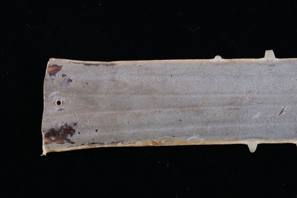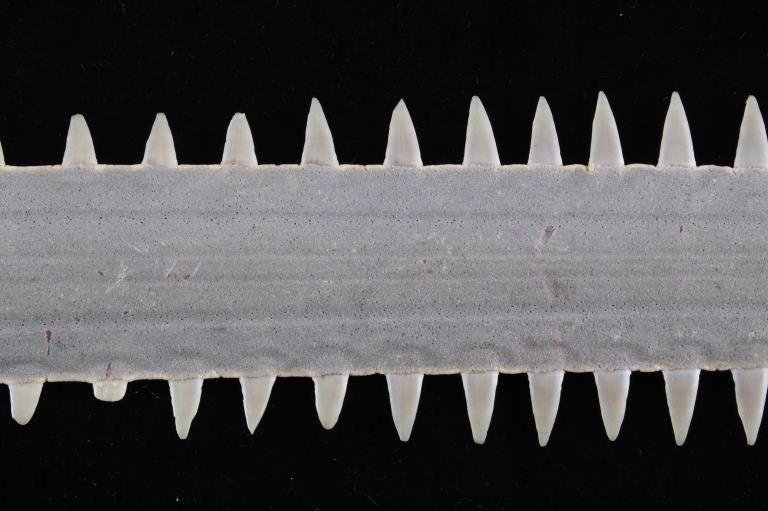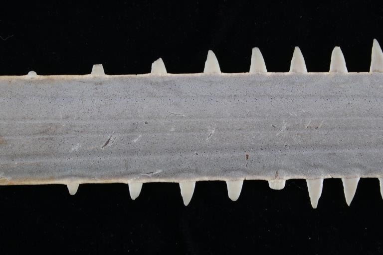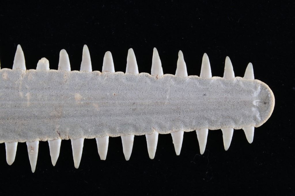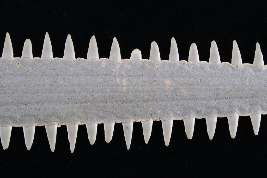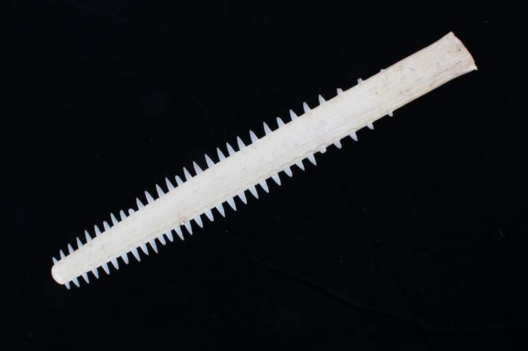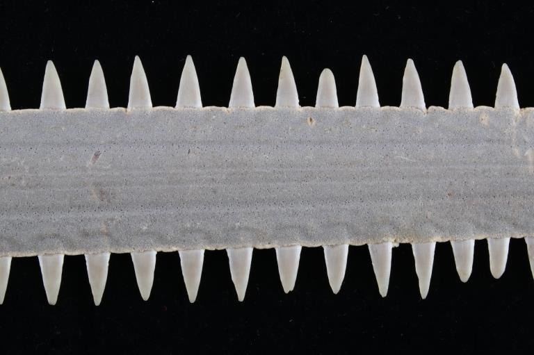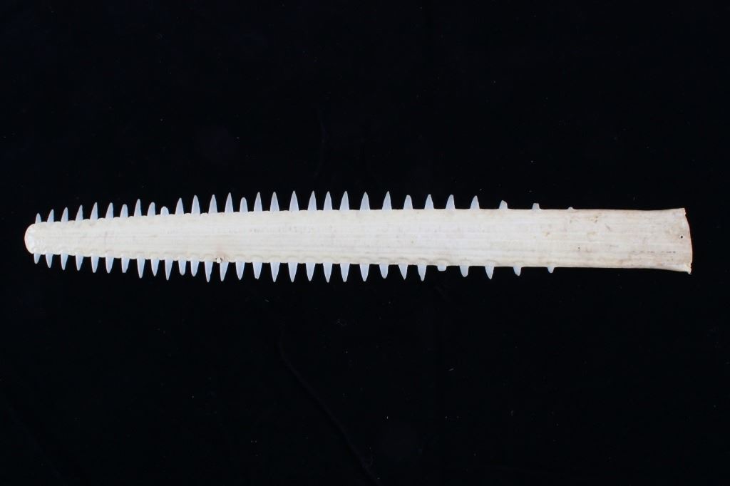 The lot features a fantastic and rare Sawfish Rostrum bill with teeth all the way around the bill. The piece dates to pre-1950 and shows the full bill with grey coloring on one side and the other side a creamy yellow. The bill has teeth all the way around with no apparent missing teeth. This displays wonderfully on your collection shelf of curiosities and is legal to own. Measures overall 20.75"L by 2 7/8"W.