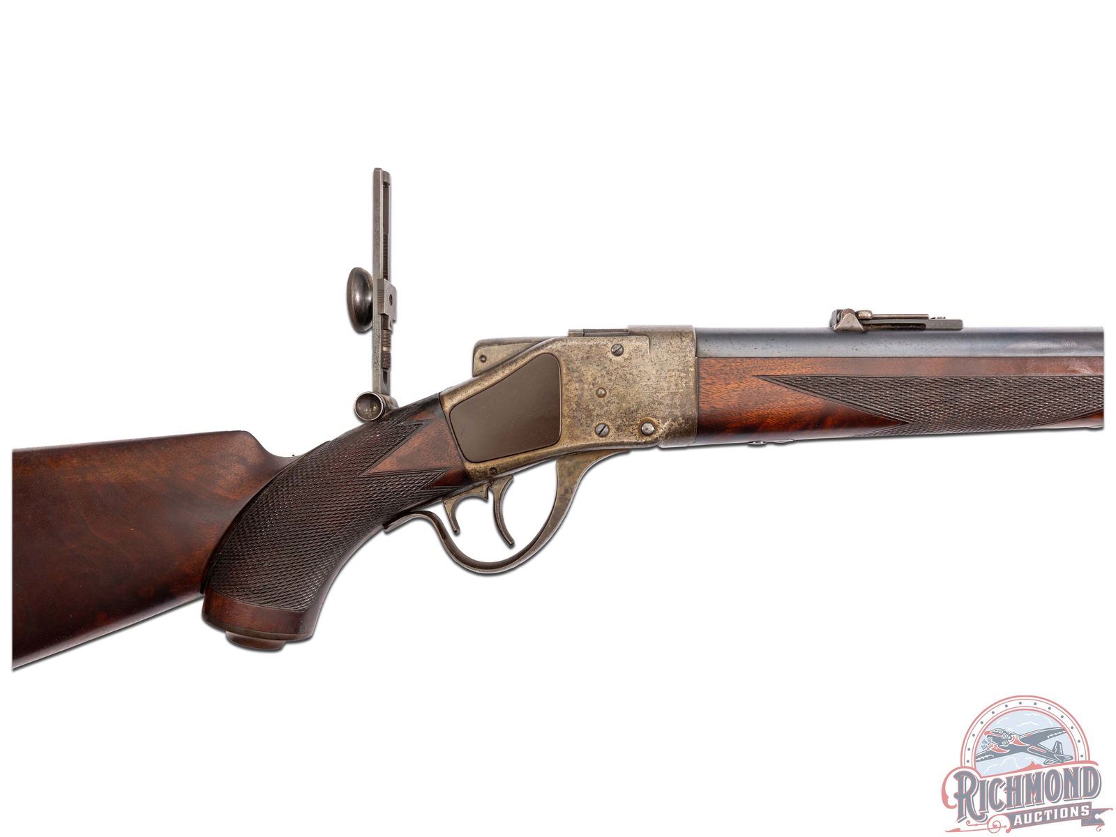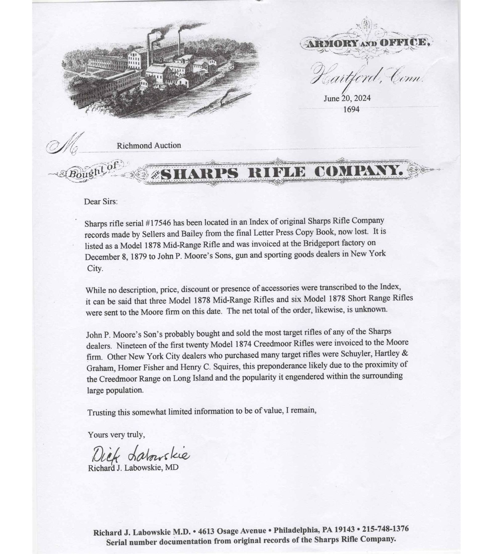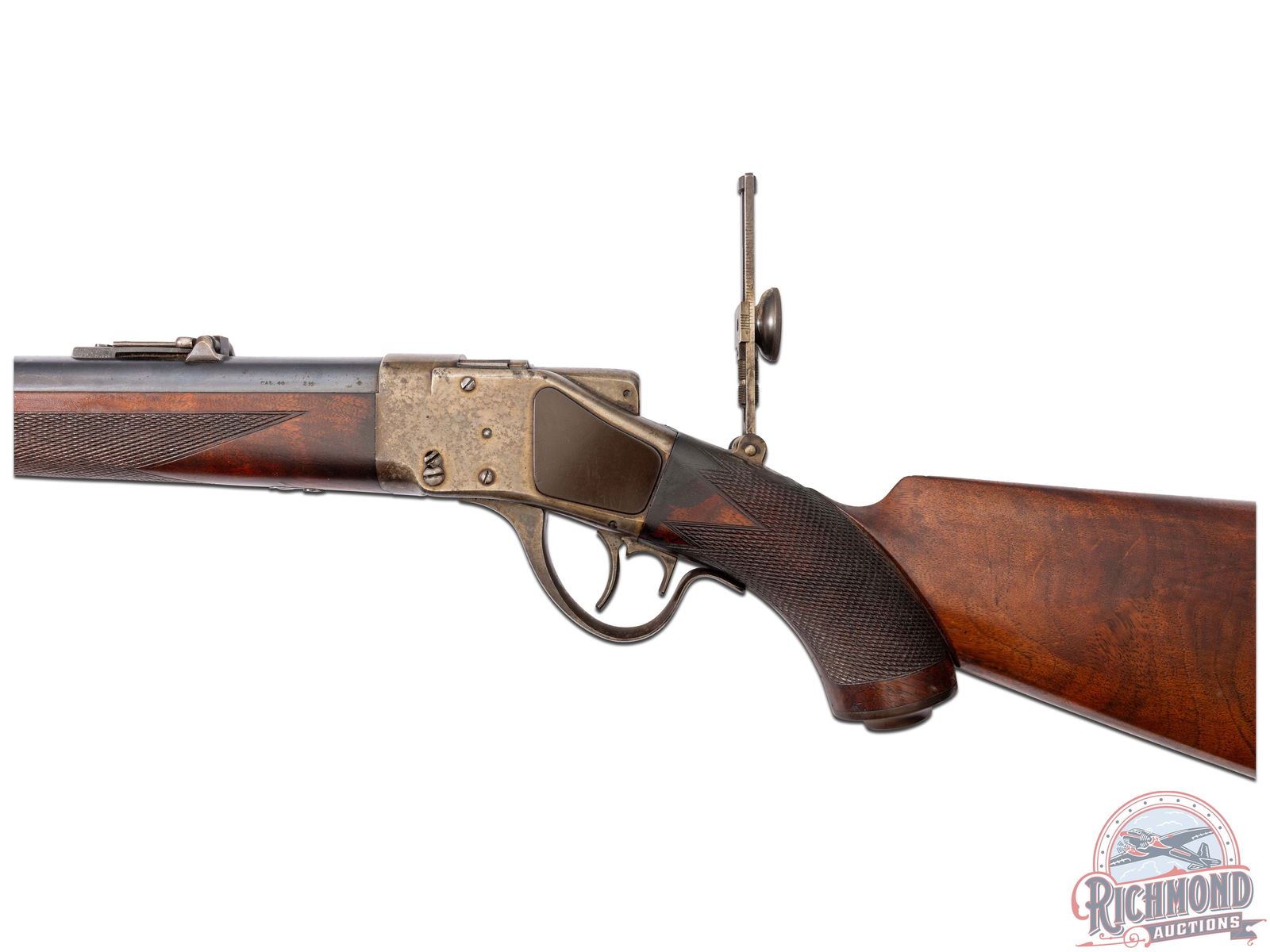 Made by the Sharps Rifle Company of Bridgeport, Connecticut in 1879. According to the Factory letter, this rifle was shipped to John P. Moore & Sons of New York City on December 8, 1879. Moore was one of Sharps best customers and according to research probably bought the most of any dealer. J.P. Moore was a New York City sporting goods dealer starting circa 1859 until 1888 when Schoverling Daly and Gates purchased the business. This business was in a prime location near the Creedmoor range on Long Island. These rifles are rare with "Frank Seller's" listing of 215 made in his book "Sharp's Firearms". This rifle features a 30" blued round tapered barrel with "New Model" spirit level Wind gauge sight with "Old Reliable" barrel marking with Sharps address and rear graduated Lawrence flip sight. Case-hardened action serial number "17546" underlever with hard rubber action panels. Action has plain faced trigger in standard configuration. Tang fitted with mid-range Vernier measuring 4-1/4" from top to pivot point. Figured American walnut checkered pistol grip stock with "zig-zag" pattern. Stock is fitted with unmarked checkered hard rubber butt plate and hard rubber plain pistol grip cap. Matching walnut checkered Schnabel forearm with palm rest plate. Comes with factory letter. J.T. Livengood Collection. CALIBER: 40-70 - 2-1/2. S/N: 17546. FFL STATUS: Antique.