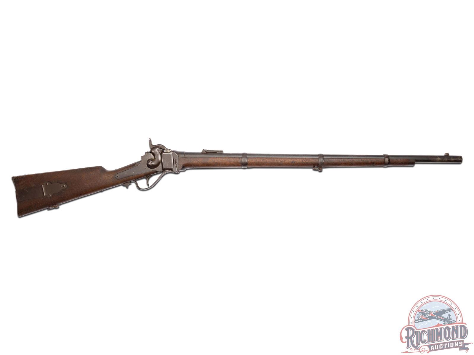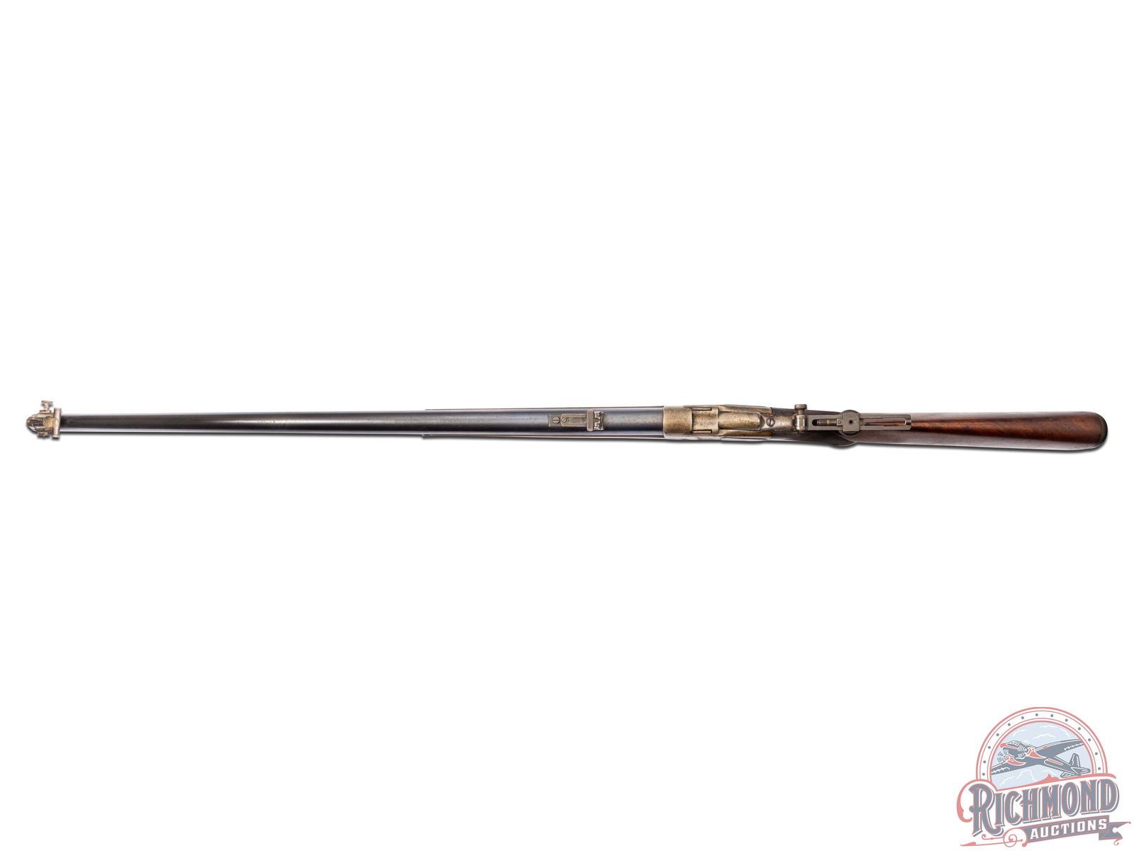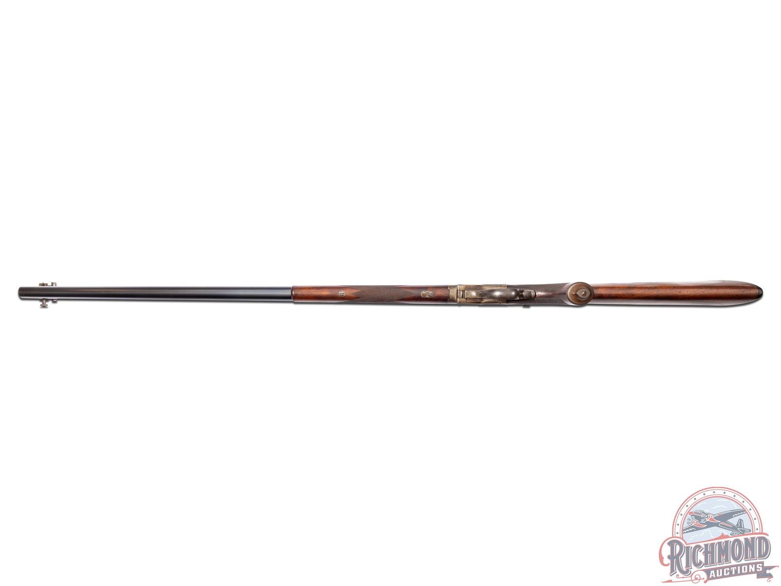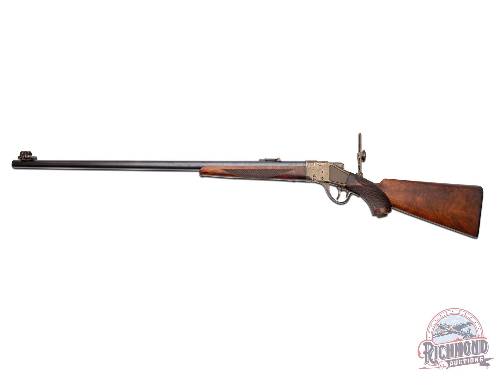 Made by the Sharps Rifle Company of Bridgeport, Connecticut in 1879. According to the Factory letter, this rifle was shipped to John P. Moore & Sons of New York City on December 8, 1879. Moore was one of Sharps best customers and according to research probably bought the most of any dealer. J.P. Moore was a New York City sporting goods dealer starting circa 1859 until 1888 when Schoverling Daly and Gates purchased the business. This business was in a prime location near the Creedmoor range on Long Island. These rifles are rare with "Frank Seller's" listing of 215 made in his book "Sharp's Firearms". This rifle features a 30" blued round tapered barrel with "New Model" spirit level Wind gauge sight with "Old Reliable" barrel marking with Sharps address and rear graduated Lawrence flip sight. Case-hardened action serial number "17546" underlever with hard rubber action panels. Action has plain faced trigger in standard configuration. Tang fitted with mid-range Vernier measuring 4-1/4" from top to pivot point. Figured American walnut checkered pistol grip stock with "zig-zag" pattern. Stock is fitted with unmarked checkered hard rubber butt plate and hard rubber plain pistol grip cap. Matching walnut checkered Schnabel forearm with palm rest plate. Comes with factory letter. J.T. Livengood Collection. CALIBER: 40-70 - 2-1/2. S/N: 17546. FFL STATUS: Antique.
