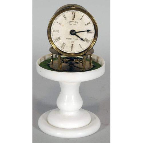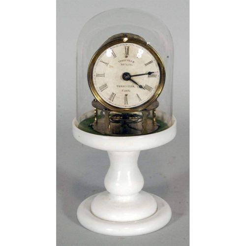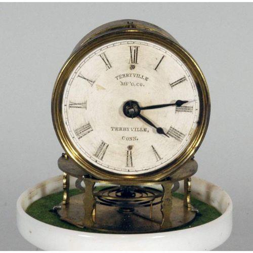 RARE TERRYVILLE CANDLESTICK CLOCK 9 3/4" high (including dome) with milkglass base, original paper face, dome cracked, but probably original mid-19th century CONDITION REPORT: dome cracked, otherwise remarkable original condition. PACKING AND SHIPPING: We offer packing (double boxed in most cases) and shipping of this item within the Continental United States by USPS or UPS (our choice- boxes over 30lbs or oversized may be recalculated based on buyer's location), NOT INCLUDING INSURANCE (it will be added when we know the sales price) for $40